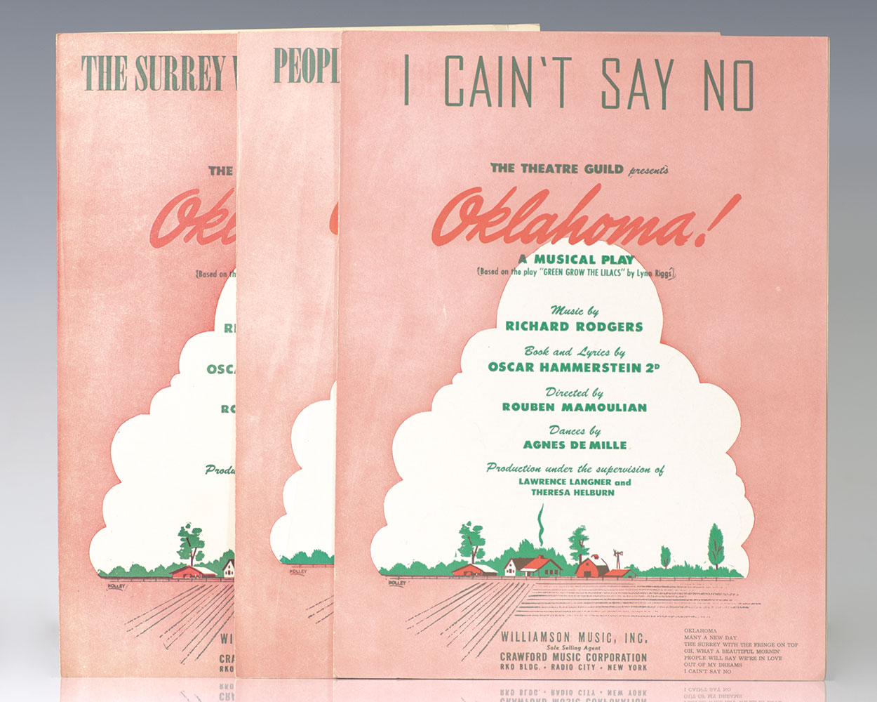 Collection of three musical scores from Rodgers and Hammerstein's popular musical Oklahoma! Quarto, three volumes, original illustrated wrappers. The collection includes piano scores for The Surrey With The Fringe On Top, People Will Say We're In Love, and I Cain't Say No. In very good to near fine condition.