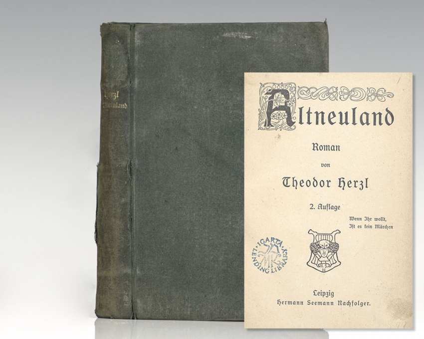 Second edition of Herzl's Utopian novel in which he envisioned the social and cultural climate of a new Hebrew Nation. Octavo, original cloth. In good condition. Rare.
