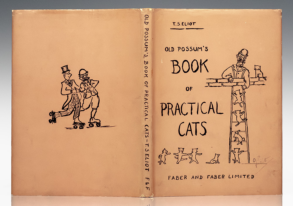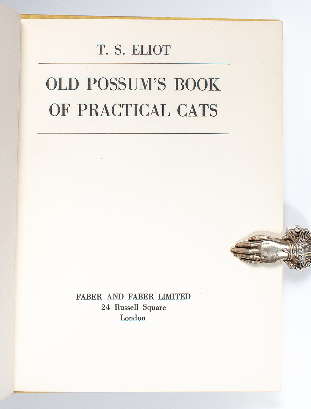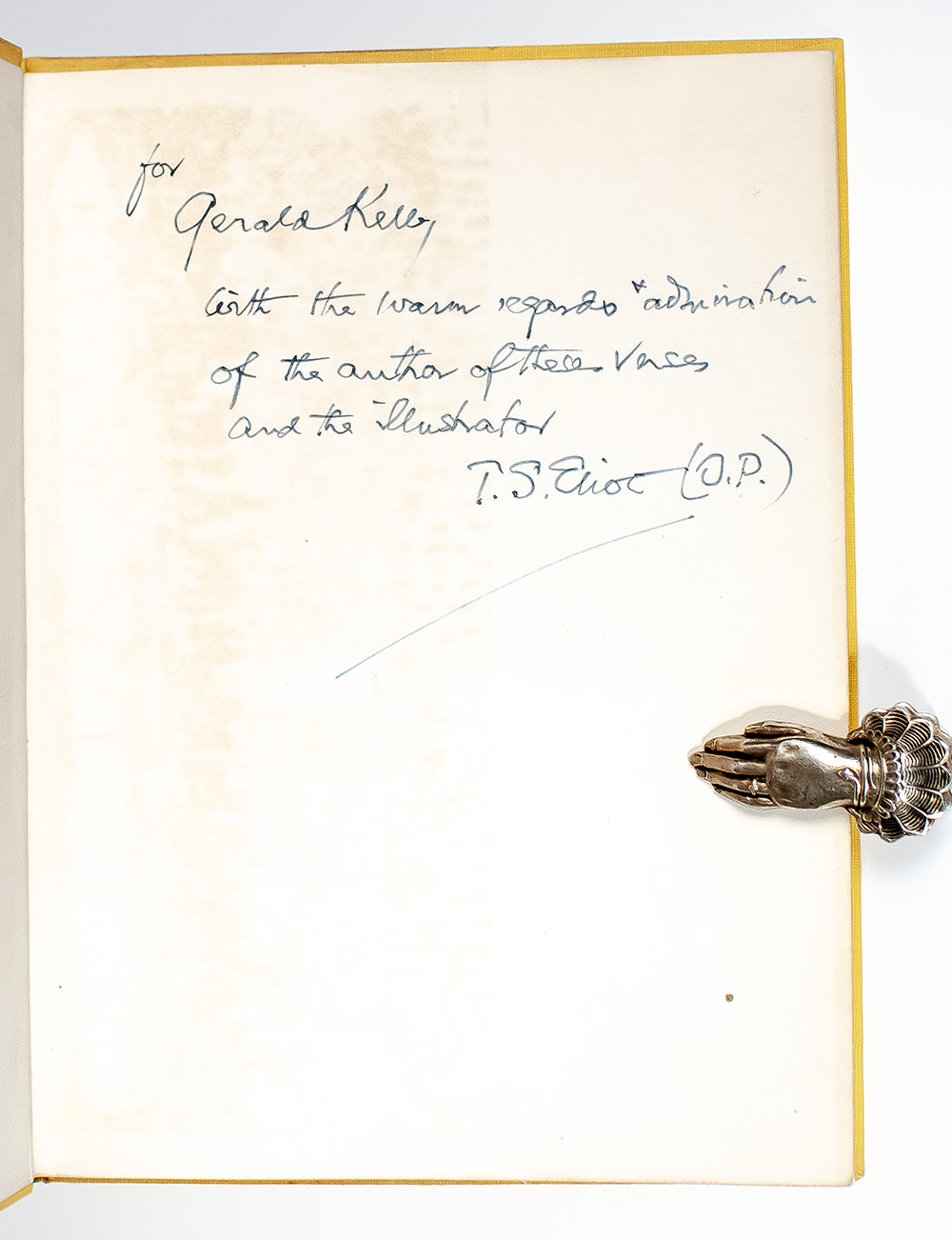 Later printing of Eliot's beloved collection of whimsical feline poems which served as the basis for Andrew Lloyd Webber's 1981 megamusical phenomenon Cats. Octavo, original yellow pictorial cloth, illustrated by T. S. Eliot. Association copy, inscribed by the author to portrait painter Sir Gerald Kelly on the front free endpaper, "For Gerald Kelly with the warm regards & admiration of the author of these verses and the illustrator, T.S. Eliot (O.P.)" Eliot and the recipient, Gerard Kelly, struck up a close friendship back in the early 1920s, and in 1960 Kelly was commissioned to paint a portrait of Eliot, which is now on permanent display at the Smithsonian Institute. Eliot has amended two poems with blue ink: 'Of The Awefull Battle of the Pekes and the Pollicles...' (line 6 reading 'They will now and again join in to the fray' corrected to 'Or now and again they join in to the fray') and 'Shimbleshanks: The Railway Cat' (line 56 reading 'In the watches of the night he is always fresh and bright' amended to 'Through hours of the night he is always fresh and bright'). Near fine in a near fine pictorial dust jacket. Jacket illustration by T.S. Eliot. Exceptionally rare signed and inscribed.