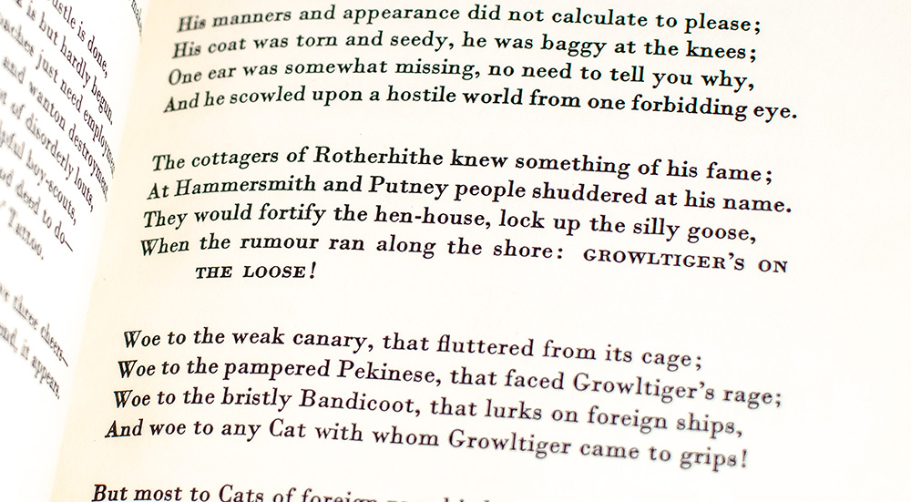 "Jellicle Cats come out tonight, Jellicle cats come one come all: the jellicle moon is shining bright- jellicles come to the jellicle ball": Old Possum's Book of Practical Cats; Inscribed by T.S. Eliot