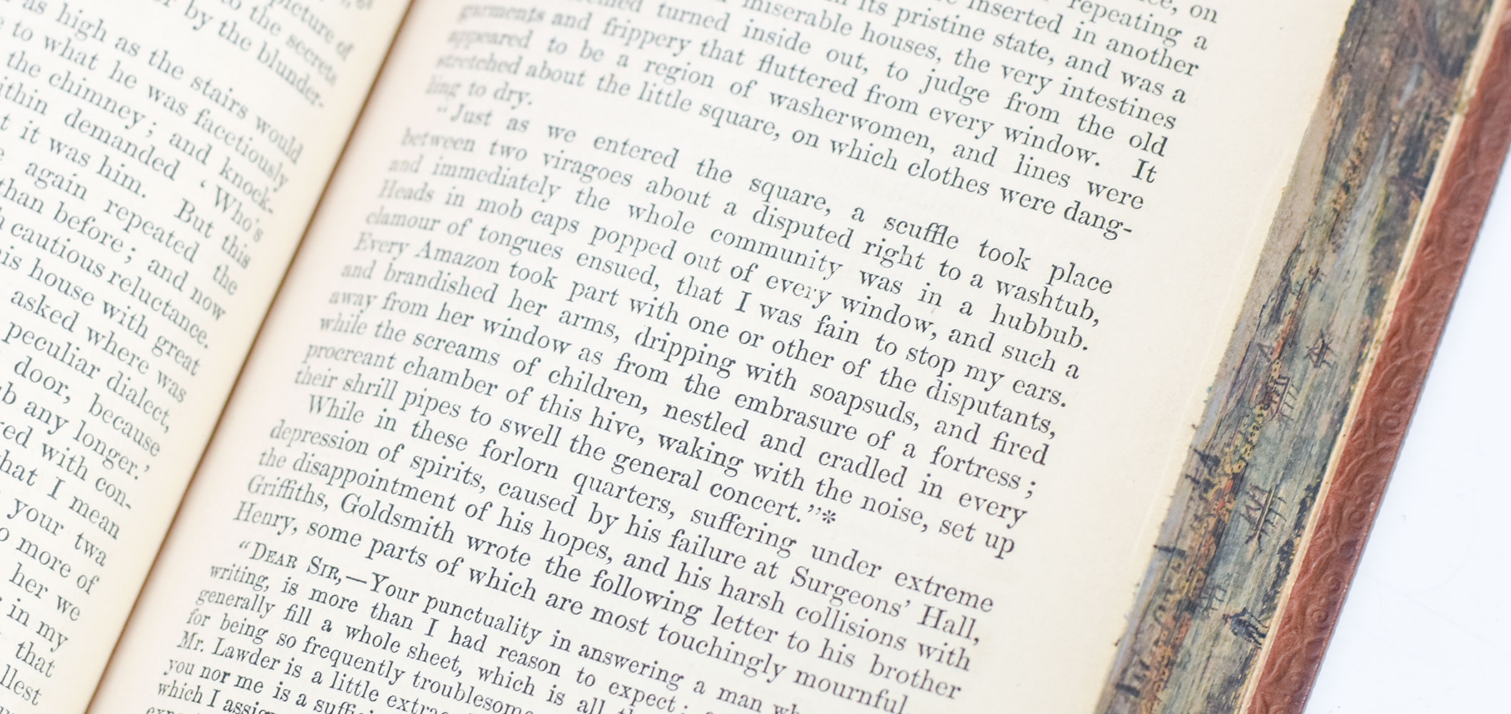 Finely bound example of Goldsmith's biography of the famed novelist. 16 mo, bound in full polished calf with gilt titles and tooling to the spine in six compartments within raised gilt bands, double gilt ruling to the front and rear panels, gilt turn-ins and inner dentelles, marbled endpapers, all edges marbled, decorated with a double fore-edge painting revealing two cityscapes. In very good condition.