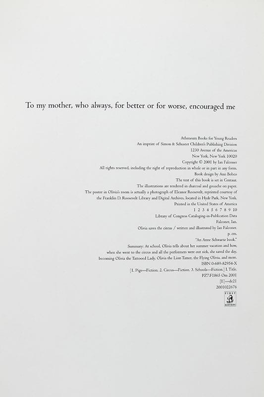 Ian Falconer is the author and illustrator of the Olivia book series, including Olivia, Olivia Helps with Christmas, Olivia and the Fairy Princesses, Olivia and the Missing Toy, Olivia Saves the Circus, to name a few. Falconer’s illustrations have graced numerous covers of The New Yorker. He has also designed sets and costumes for the New York City Ballet, the San Francisco Opera, the Royal Opera House, and many others.