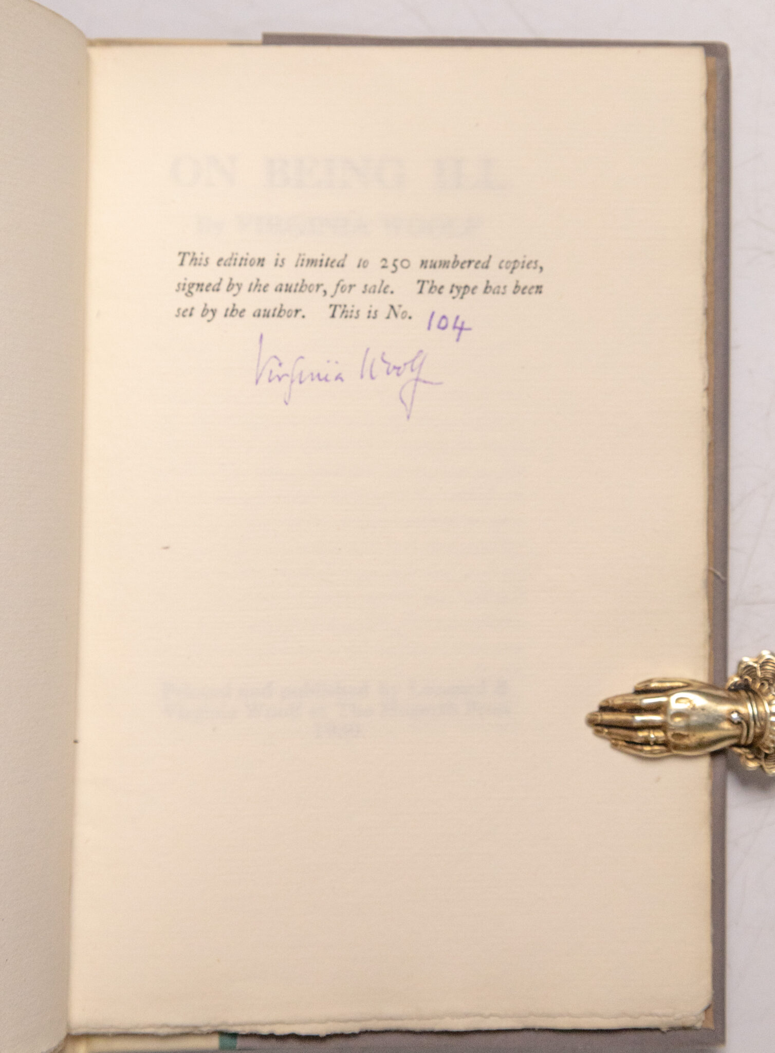 Signed limited edition and first edition in book form of this meditation on the literary possibilities of illness. One of 250 numbered copies signed by Virginia Woolf in her characteristic purple ink on the limitation page, this is number 104. Octavo, original half vellum over green silk boards, marbled endpapers. Fine in the rare original dust jacket which is in exceptional condition. Easily the nicest example we have seen.