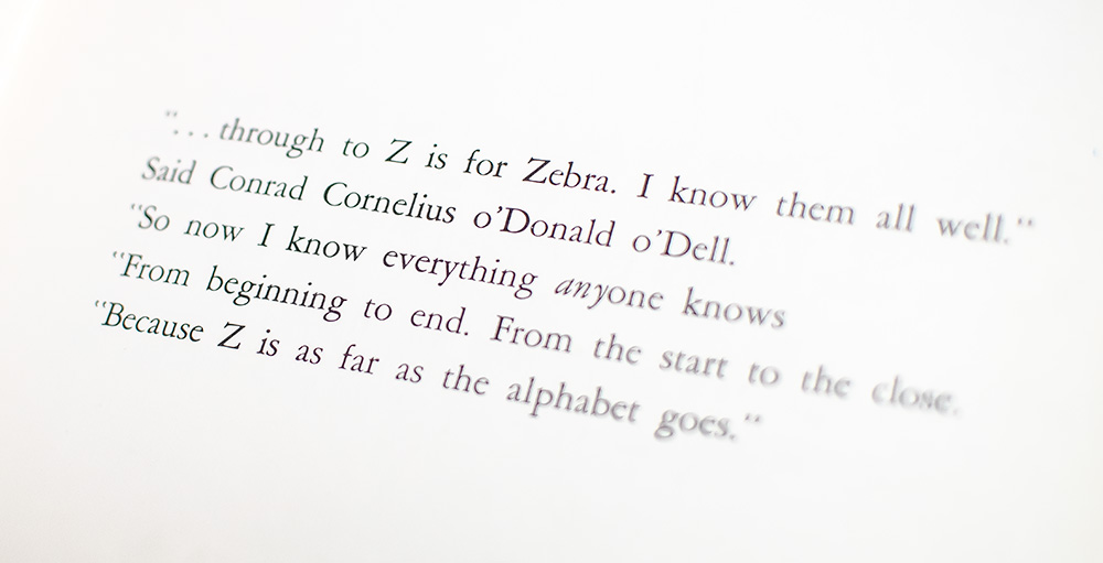 Dr. Seuss’s On Beyond Zebra! (1955) challenged conventional notions of language and imagination through its playful expansion of the alphabet. By introducing fictitious letters beyond “Z,” Seuss critiqued the limitations of standardized thinking and celebrated creative exploration. The narrator, young Conrad Cornelius o'Donald O'Dell, initially believed he had mastered the alphabet, only to be shown by another boy that real discovery began where conventional knowledge ended. The invented letters, each tied to a whimsical creature, illustrated Seuss’s broader themes of intellectual curiosity and the subversive power of imagination. This post-alphabetic structure functioned as a metaphor for unbounded creativity, urging readers—especially children—to envision possibilities beyond the established order. On March 2, 2021, Dr. Seuss Enterprises, owner of the rights to Seuss's works, withdrew On Beyond Zebra! and five other books from publication. The Vancouver Sun described the "problematic imagery" as "probably the least obvious" of the six books removed from publication.