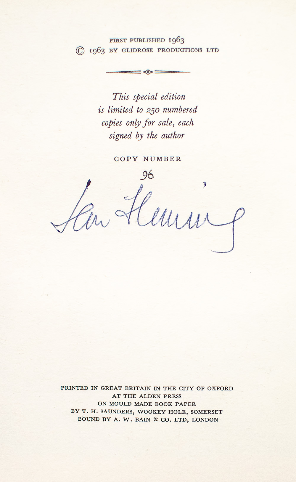 Signed limited first edition, the only Bond title issued in a limited edition, number 96 of 285 examples of the eleventh Bond novel. Octavo, original half vellum, top edge gilt, with color frontispiece portrait of Fleming by Amherst Villiers. In fine condition with the original acetate in near fine condition. Housed in a custom chemise and half morocco clamshell box. An exceptional example.