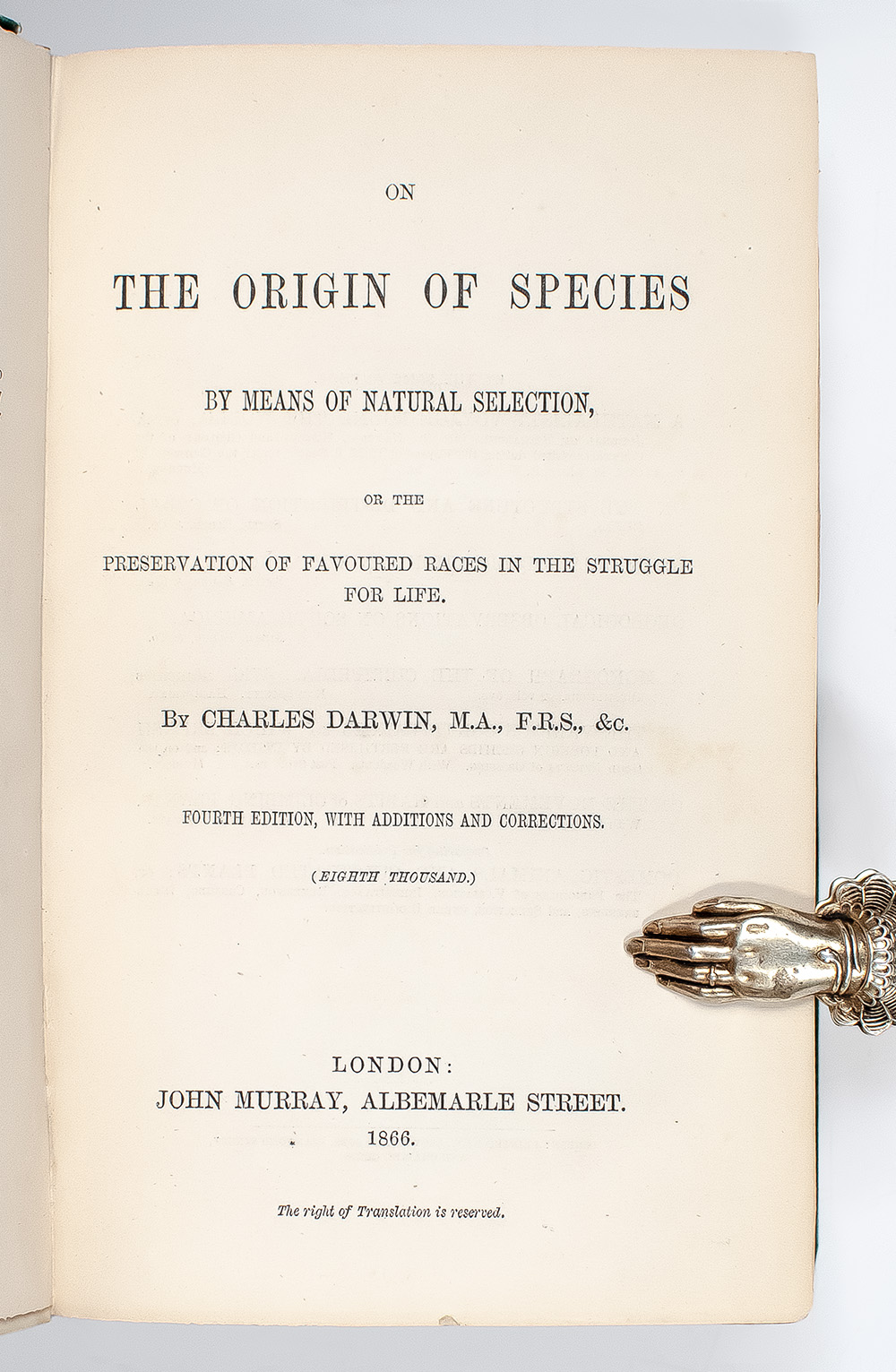 Fourth edition, eighth thousand, one of 1500 copies of "certainly the most important biological book ever written" (Freeman), one of the smallest printings for any of the six editions published in Darwin's lifetime, save for the first edition of 1250 copies. Octavo, bound in original green publisher's cloth with gilt titles to the spine, illustrated with a folding plate bound at page 130, with April 1867 advertisements. In good condition with a few small losses to the crown and foot of the spine, some splitting to the interior hinges, and some rubbing to the extremities, spine, front and rear panels.