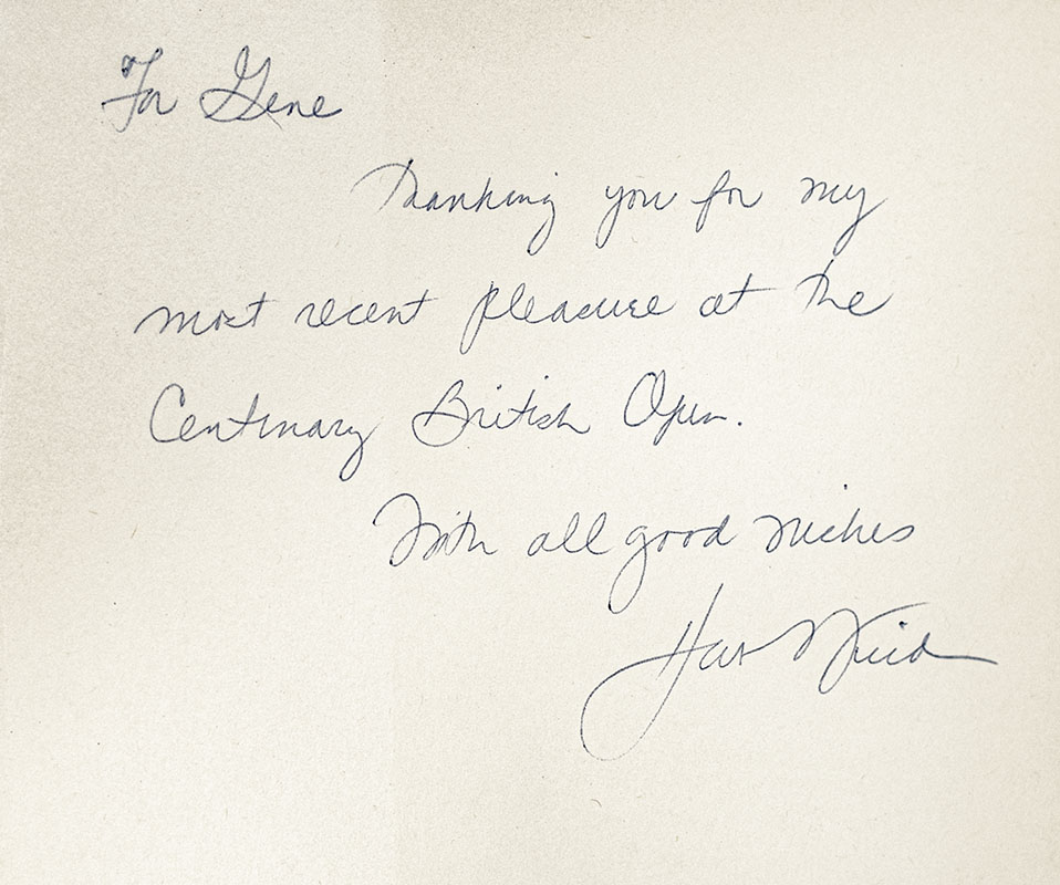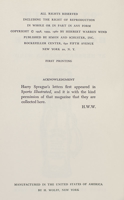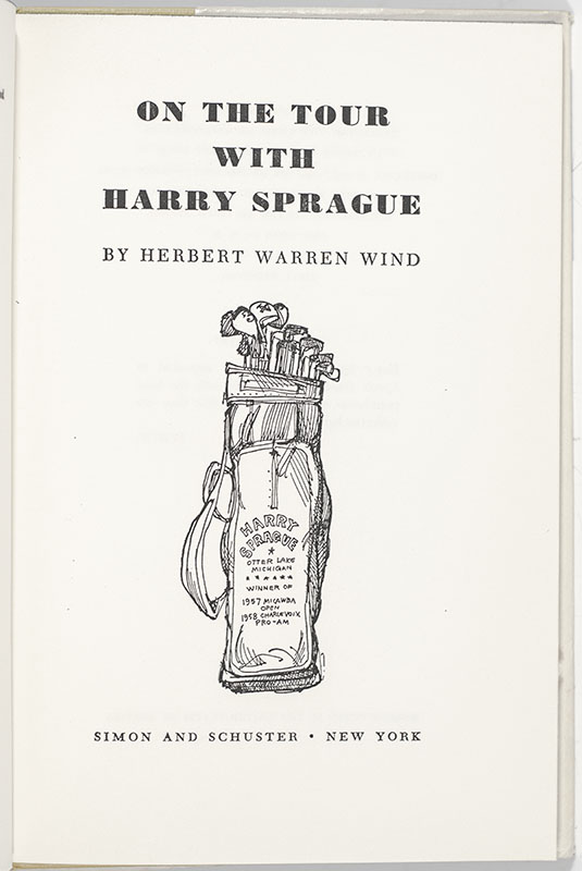 First edition of this work by America’s greatest golf writer cracks wise in this humorous peek inside the life and mind of an up-and-coming young pro. Octavo, original cloth, illustrated with drawings. Association copy, inscribed by the author on front free endpaper to Gene Sarazen, "For Gene Thanking you for my most recent pleasure at the Centenary British Open With all good wishes Herb Wind." The recipient Gene Sarazen was a professional golfer and the winner of seven major championships. He is one of five players (along with Ben Hogan, Gary Player, Jack Nicklaus, and Tiger Woods) to win each of the four majors at least once. Fine in a near fine dust jacket. Jacket design by Paul Bacon. Introduction by Jimmy Demaret. D&M 40300. An exceptional association.