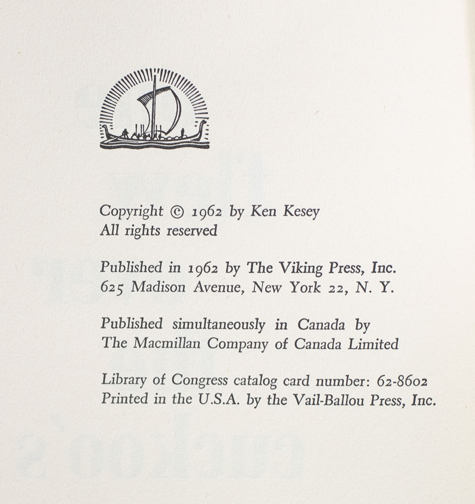 First edition of the author's classic first book. Octavo, original cloth. Presentation copy, inscribed by the author on the front free endpaper, ""For Burwood Stoekueskyi _____ ____ Ken Kesey." Near fine in a near fine first-issue dust jacket. Jacket design by Paul Bacon. An exceptional example.