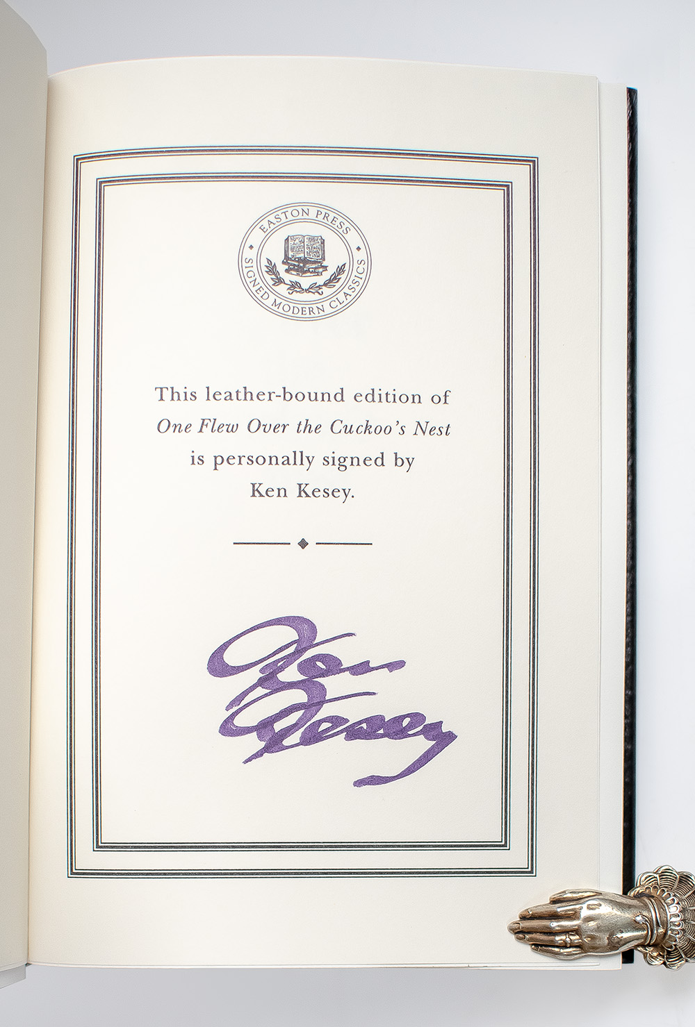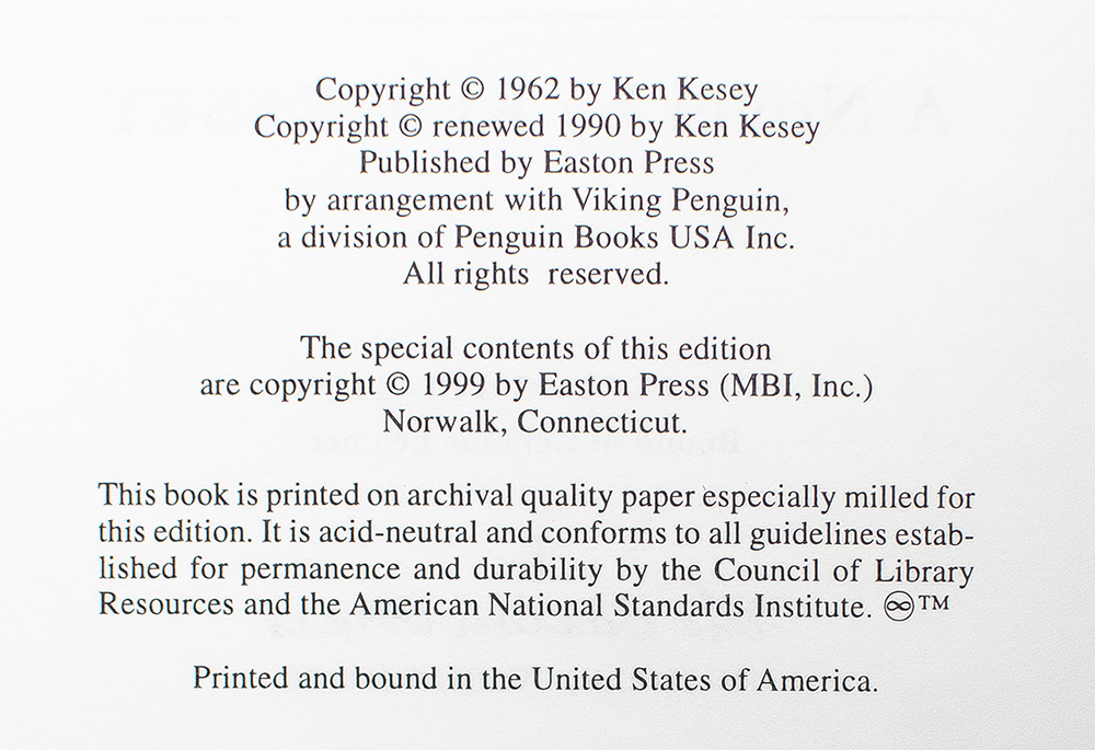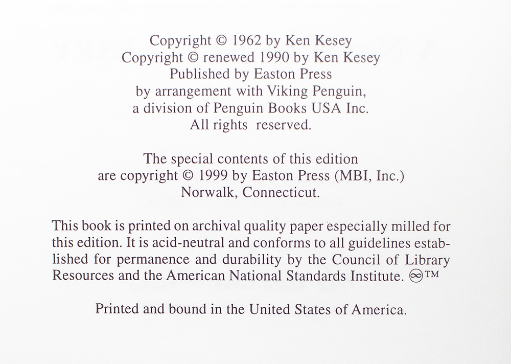 Signed limited first edition of the Easton Press edition of Kesey's classic work. Octavo, original black leather, gilt titles and tooling to the spine, front and rear panels, all edges gilt, silk ribbon bound in. Boldly signed by Ken Kesey. In fine condition.