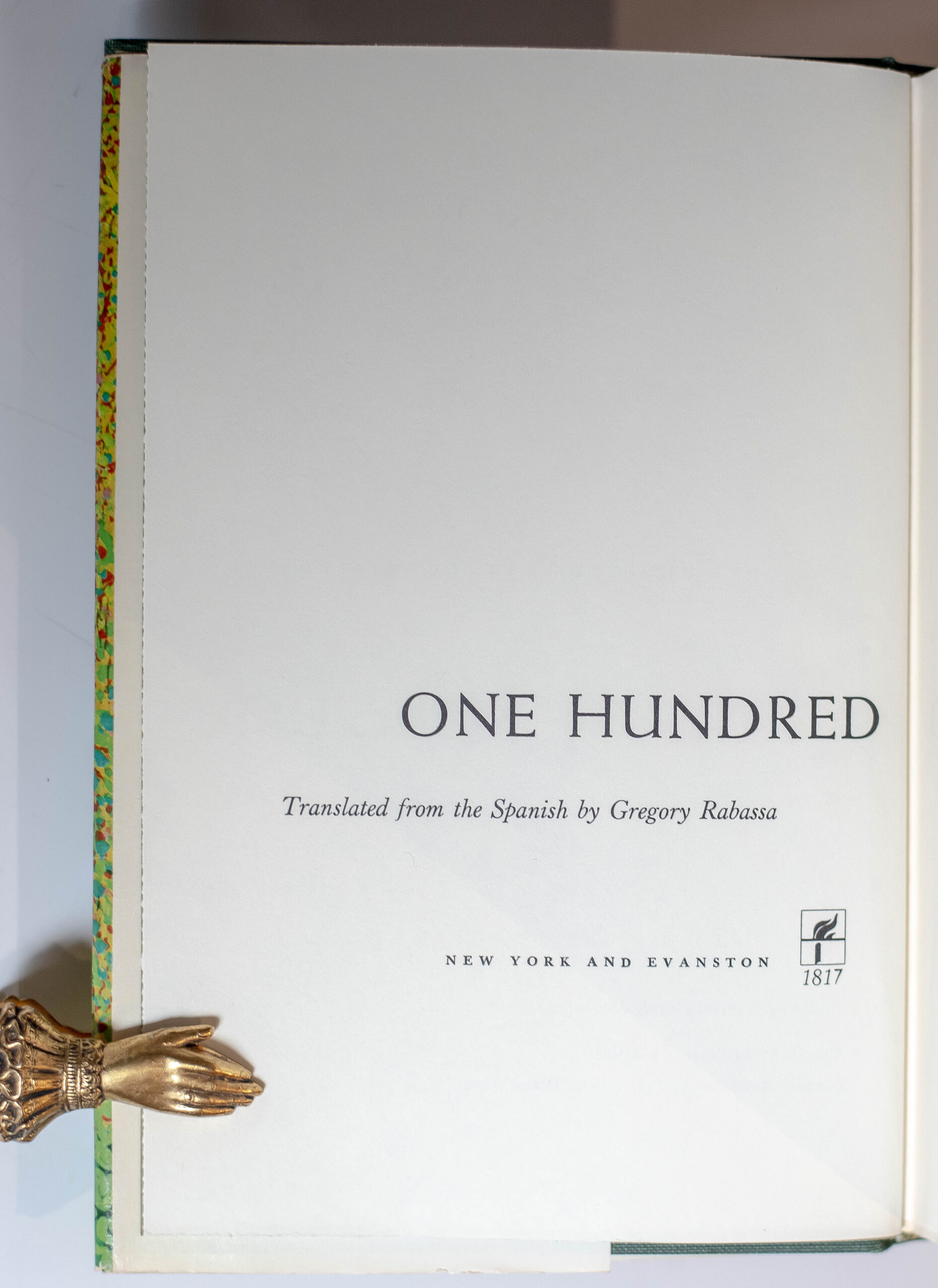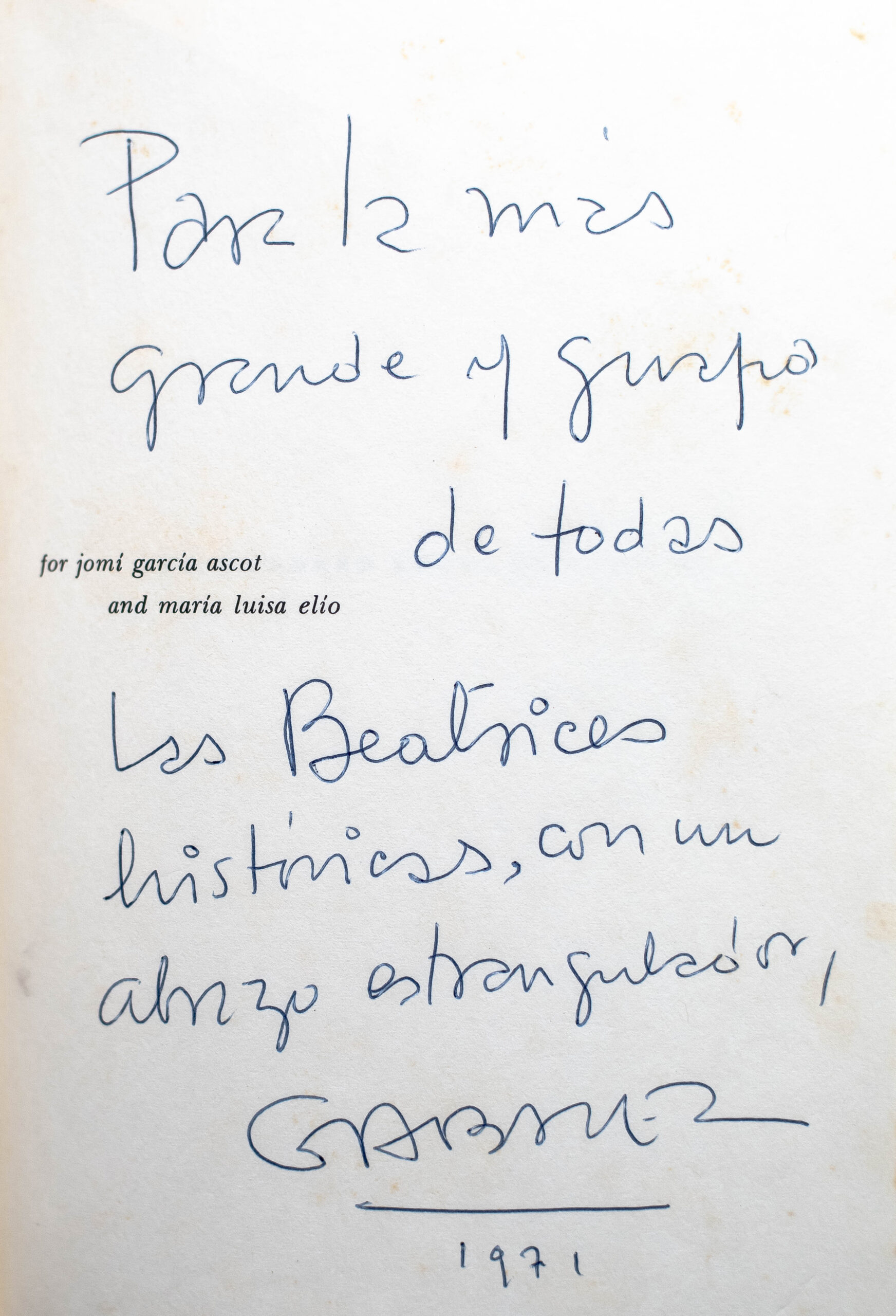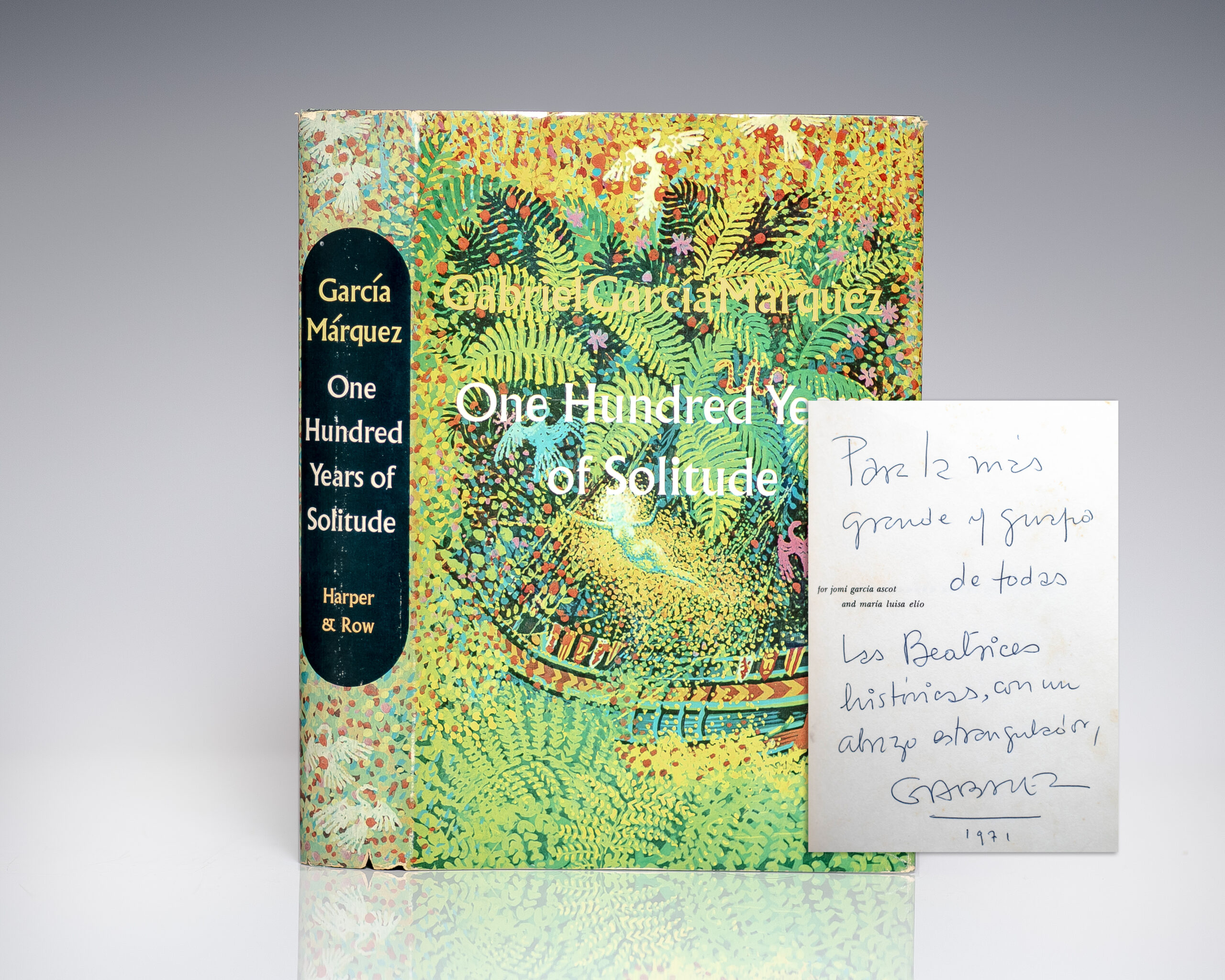 First American edition of the author's magnum opus. Octavo, original green cloth. Presentation copy, warmly and lengthily inscribed by the author on the dedication page, "Por la mas grande y guapa de todos las Beatrices listísimas, con un abrizo estrangulaon Gabriel Garcia Marquez 1971." Which translates into English as, "For the best, smartest, and most beautiful of all Beatrices, with a very tight hug Gabriel Garcia Marquez 1971." The recipient, Beatriz Alarcón, was a friend of Garcia Marquez's in Colombia. Near fine in a near fine first issue dust jacket with the exclamation point at the end of the first paragraph on the front flap. Jacket design by Guy Fleming.