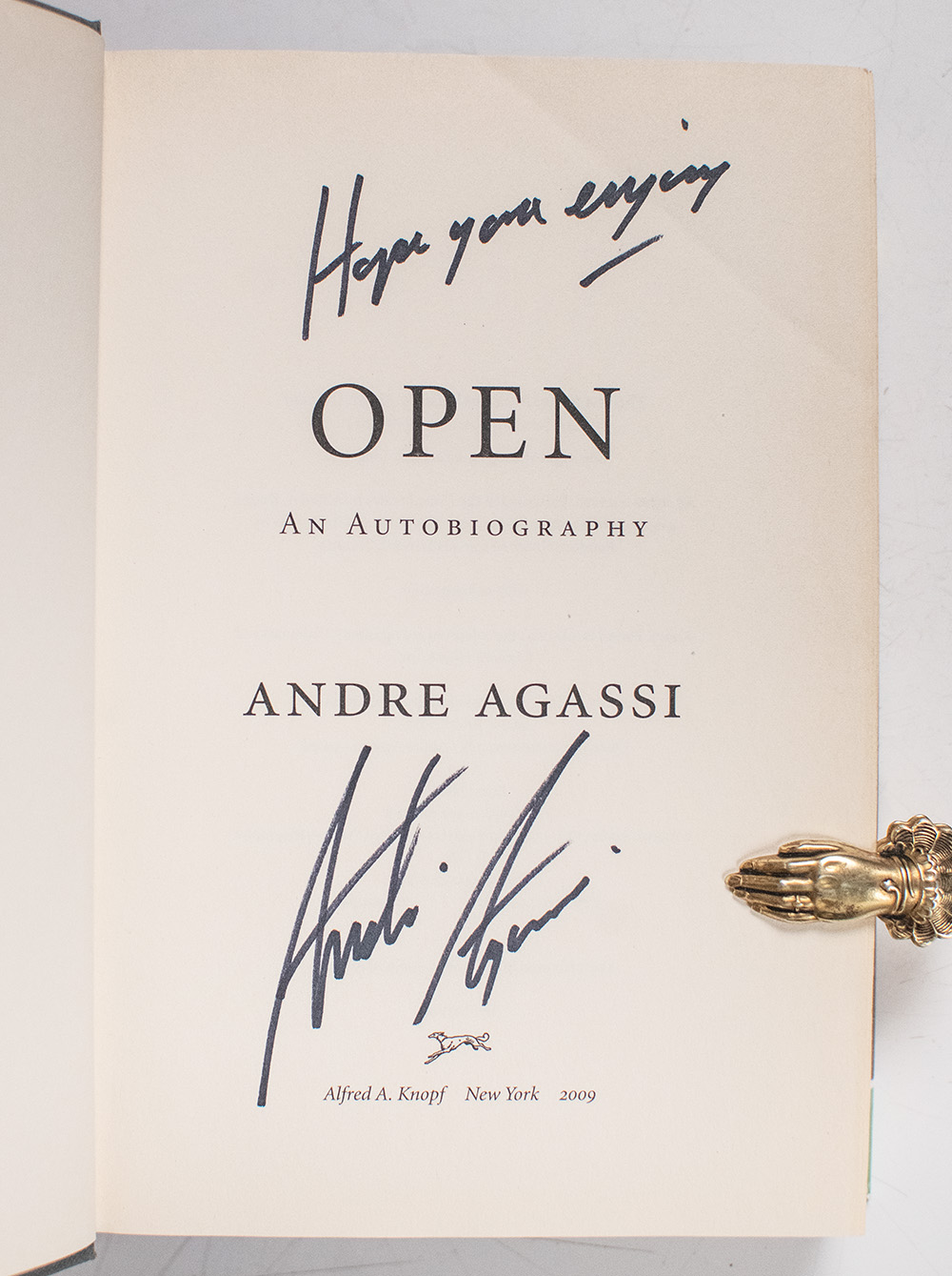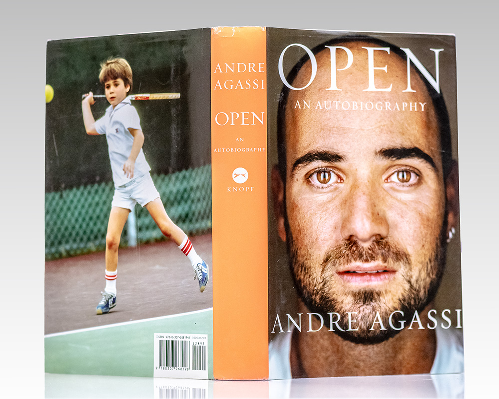 First edition of the Wimbledon champion's autobiography. Octavo, original half cloth, illustrated. Boldly signed by the author, "Hope You Enjoy Andre Agassi" on the title page. Near fine in a near fine dust jacket. Jacket design by Carol Devine Carson.