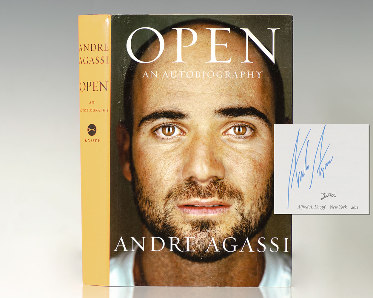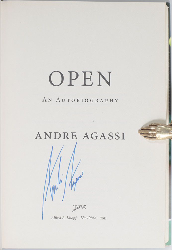 First edition, early printing of the Wimbledon champion's autobiography. Octavo, original half cloth, illustrated. Boldly signed by Andre Agassi on the title page. Fine in a fine dust jacket. Jacket design by Carol Devine Carson.