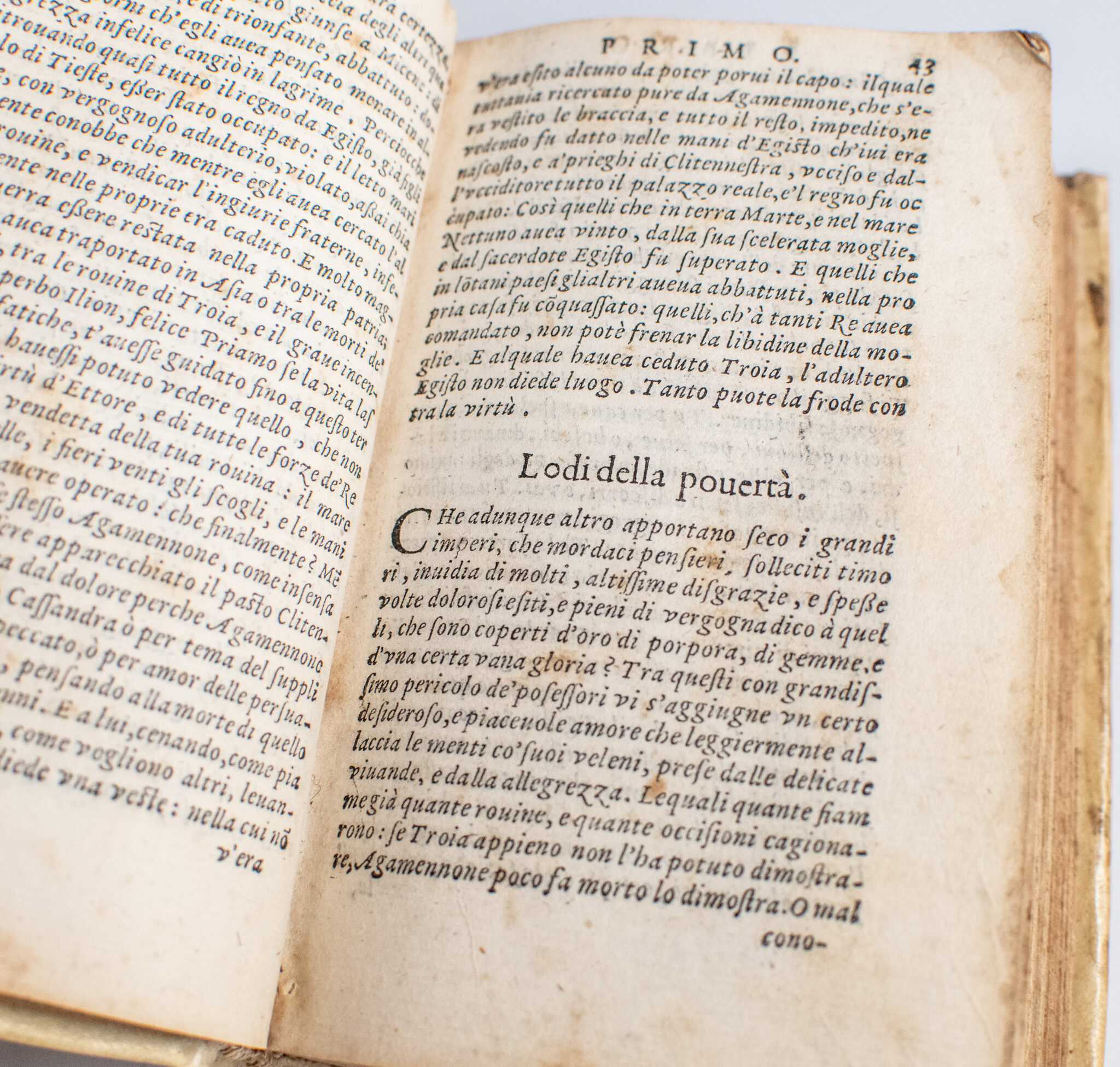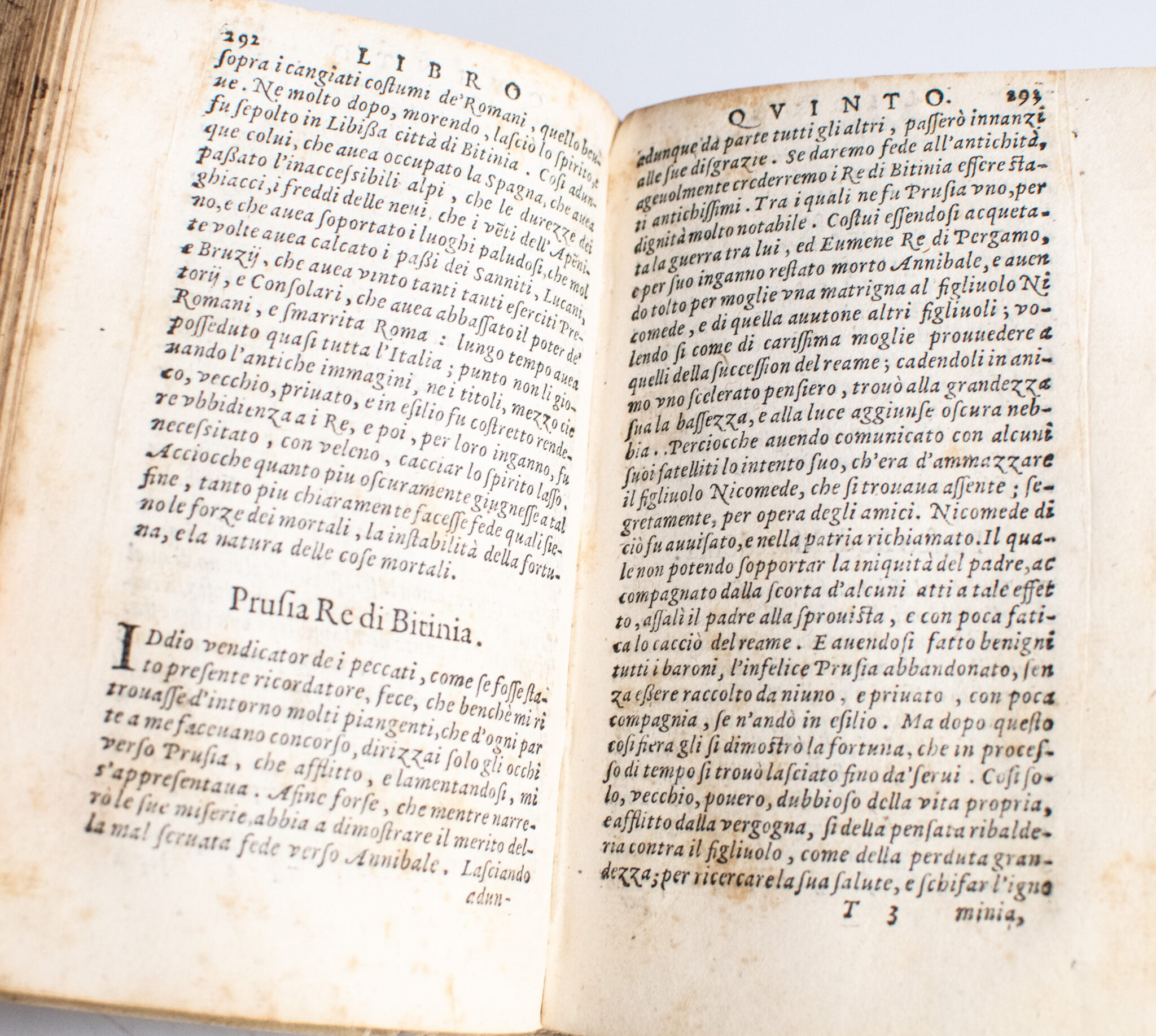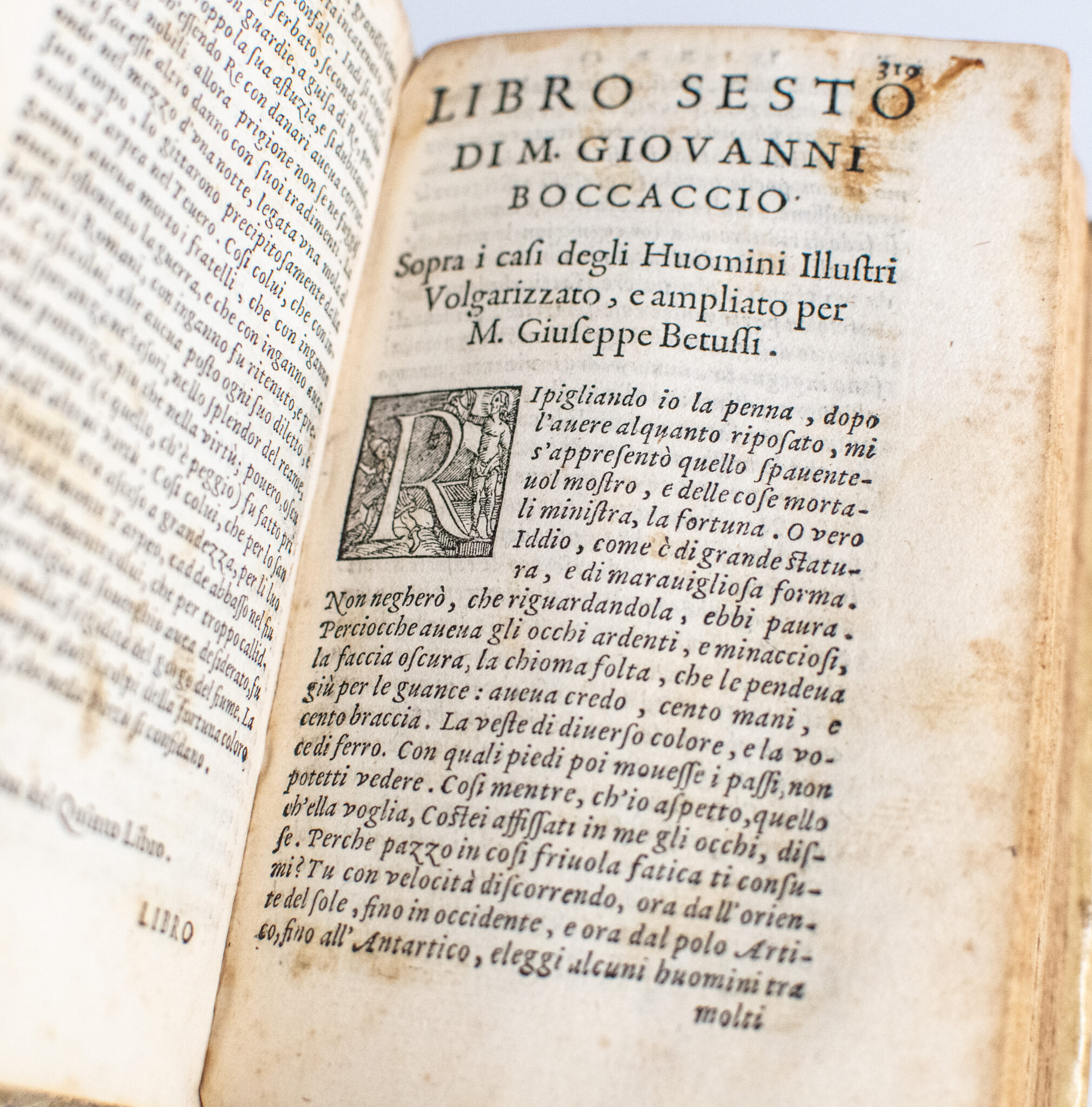Sixteenth century edition of Giovanni Boccaccio’s Latin work on the downfalls of powerful or famous historical and biblical figures. Duodecimo, written in Italian, bound in full vellum, woodcut chapter decorations. Translated and expanded by Giuseppe Betussi of Bassano. In very good condition with light toning and soiling.