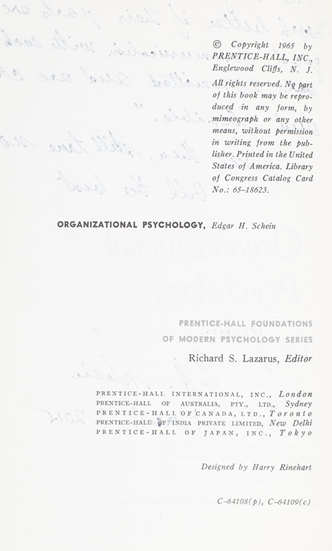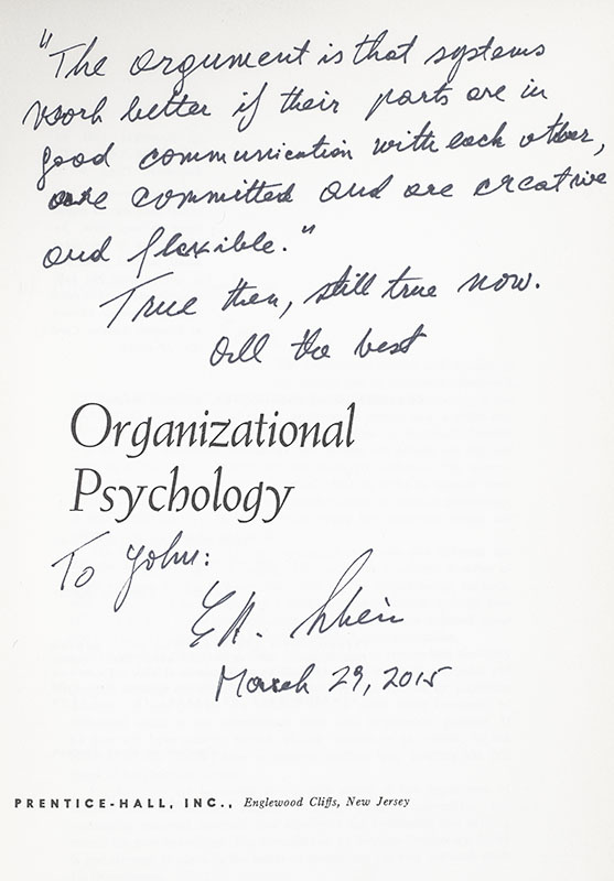First Edition of Organizational Psychology; inscribed by Edgar H. Schein with a quote from the book