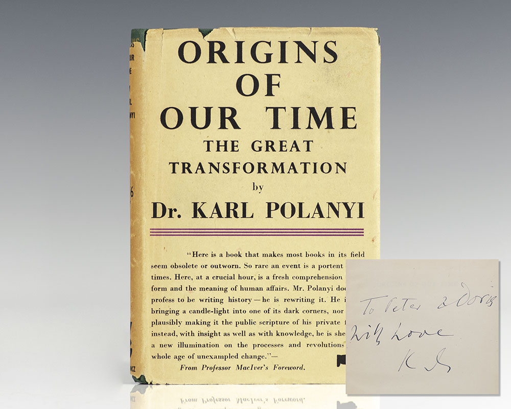 First edition, early printing of Polanyi's landmark work, which many consider to be one of the twentieth century’s most incisive and prophetic works of scholarship. Octavo, original cloth. Association copy, inscribed by the author on the title page, "To Peter and Doris With Love Karl." The recipients, Peter Drucker and his wife Doris were close friends and colleagues of Polyani. Born in Budapest, Polanyi moved to Vienna, where he met Drucker while he worked as senior editor of The Austrian Economist. In July 1940, the President of Bennington College, Robert Leigh, wrote to the publisher W.W. Norton, asking him to forward the names of refugee scholars who had been forced to leave Europe as result of the war, and who might benefit from spending a year at Bennington as “honorary fellows of the college.” Later that week, Drucker, himself a refugee, contacted Leigh with a request to bring Polanyi from Vienna to the college. “Drucker devoted an entire passage of his memoirs, Adventures of a Bystander, to the Polanyi family. Elsewhere, he noted that “perhaps I learned the most from Polanyi, although not formally because we were friends.” Among other things, Drucker described in Polanyi a talent for the practice of social ecology: “He analyzed, with an uncanny knack for seeing the importance of inconspicuous developments-at an early stage.” (Drucker’s Lost Art of Management, by Joseph A. Maciariello and Karen E. Linkletter). Both Polanyi and Drucker acknowledged each other in their major wartime works, and continued to exchange letters until Polanyi’s death in 1964. Drucker even had a hand in preparing The Great Transformation for publication after Polanyi returned to England, leaving behind an unfinished manuscript. Near fine in the rare original dust jacket with light rubbing, small name to the front free endpaper. An exceptional association. This is the first signed example we have seen.