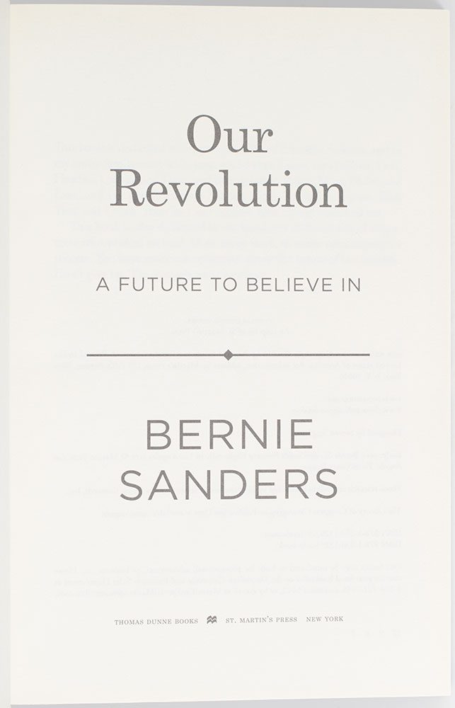 First edition of Bernie Sanders' account of his life and influences, featuring a detailed account of his campaign praised as "well worth reading… his ideas basically just as fresh to him today as when he left his native Brooklyn." Octavo, original boards, pictorial endpapers. Signed by Bernie Sanders in facsimile. Fine in a fine dust jacket. Jacket design by Michael Storrings.