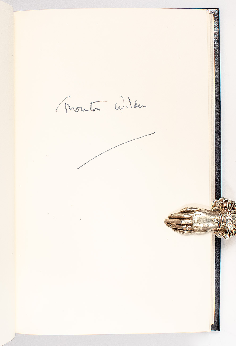 First edition of the author's second Pulitzer Prize-winning work. Octavo, bound in full morocco by the Harcourt Bindery, gilt titles and tooling to the spine in six compartments within raised gilt bands, gilt ruling to the front and rear panels, gilt inner dentelles stamp-signed by the Harcourt Bindery, marbled endpapers, all edges gilt. Boldly signed by Thornton Wilder on a page bound in. In fine condition. An exceptional presentation.