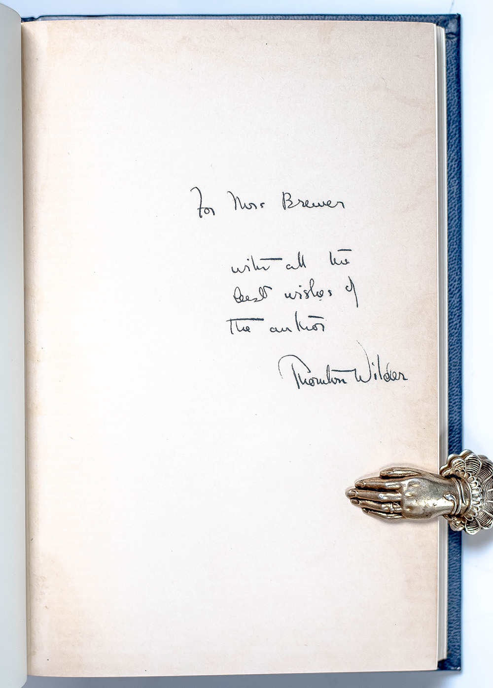 First edition of the author's second Pulitzer Prize-winning work. Octavo, bound in full morocco by the Harcourt Bindery, gilt titles and tooling to the spine in six compartments within raised gilt bands, gilt ruling to the front and rear panels, gilt inner dentelles stamp-signed by the Harcourt Bindery, marbled endpapers, all edges gilt. Presentation copy, inscribed by the author on page bound in, "For Mrs. Brewer with all the best wishes of the author Thornton Wilder." In fine condition. An exceptional presentation.
