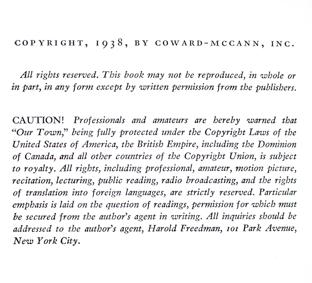 Our Town is a 1938 metatheatrical three-act play by American playwright Thornton Wilder. It tells the story of the fictional American small town of Grover's Corners between 1901 and 1913 through the everyday lives of its citizens. Our Town was first performed at McCarter Theatre in Princeton, New Jersey in 1938. It later went on to success on Broadway and won the Pulitzer Prize.
