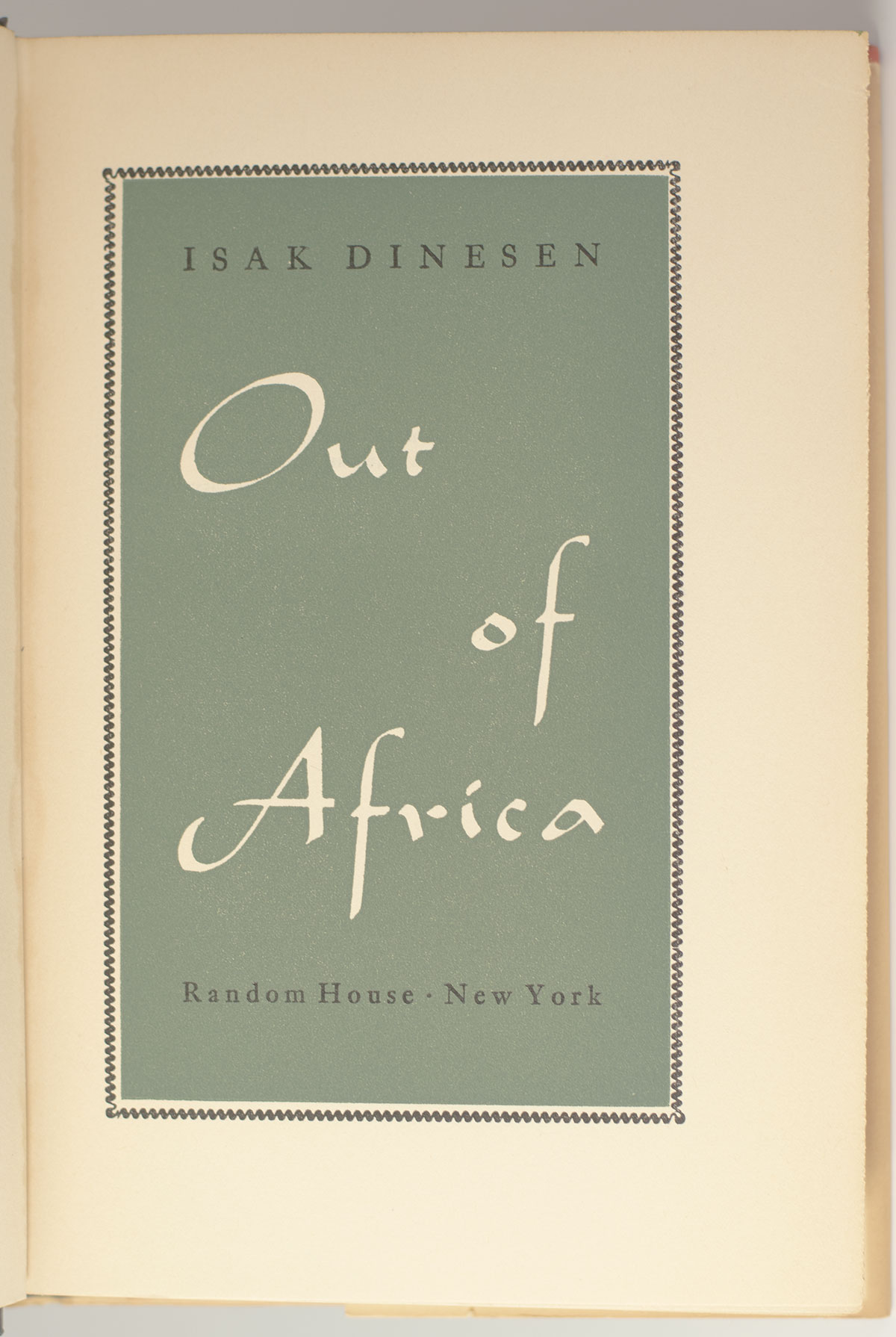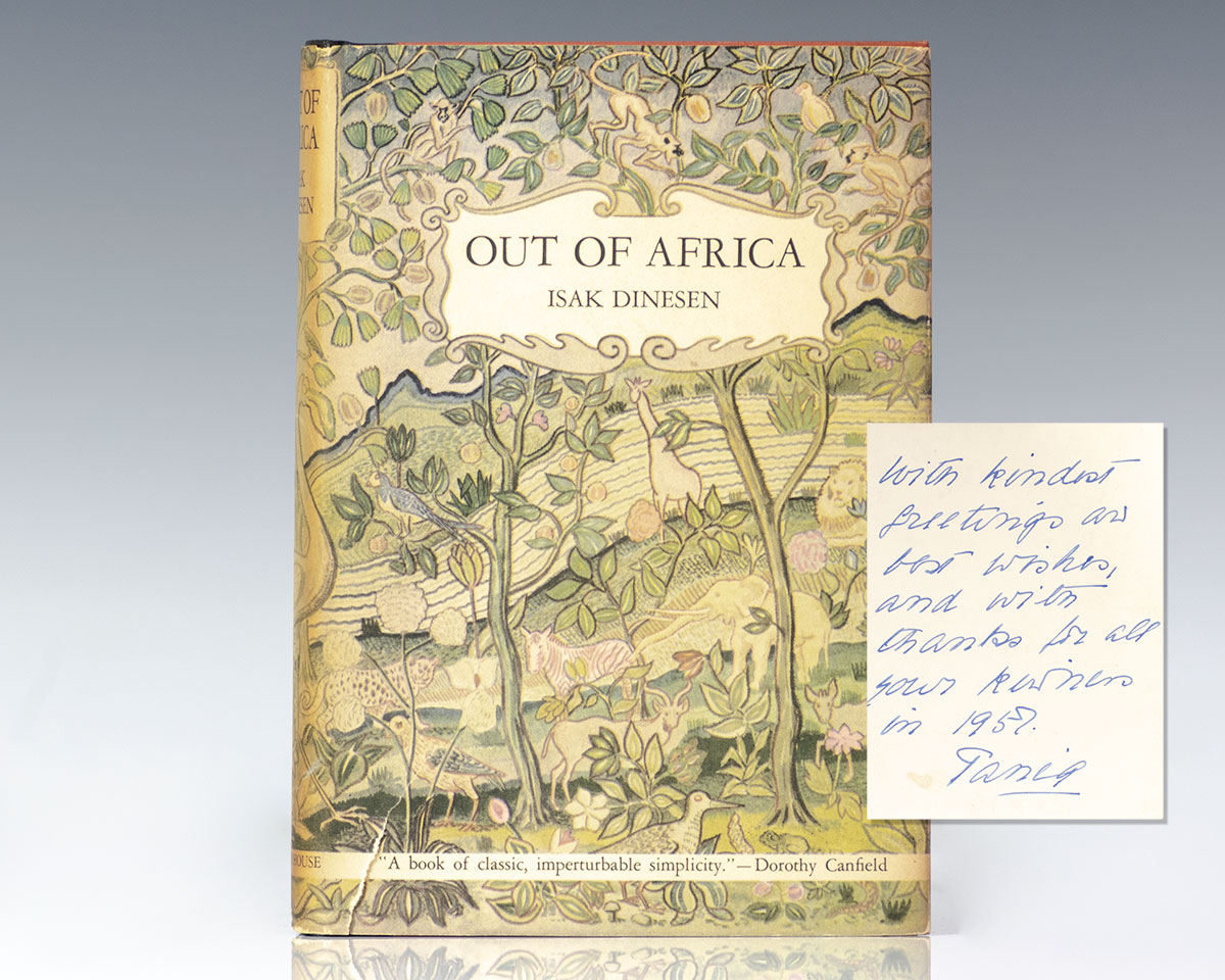 First edition of the author’s classic memoir, which recounts events of the seventeen years when Blixen made her home in Kenya. Octavo, original half cloth. With an original black and white photograph of Blixen gardening at her Rungstedlund estate, inscribed by her on the verso, "With kindest greetings and best wishes and with thanks for all your kindness in 1957 Tania." Baroness Karen Christenze von Blixen-Finecke (born Dinesen) used several pen names including: Isak Dinesen, used in English-speaking countries, Tania Blixen, used in German-speaking countries, Osceola, and Pierre Andrézel. She was born in the manor house of Rungstedlund, north of Copenhagen which she acquired from her father in 1879. Most of Blixen's writing was done at the manor in Ewald's Room, named after author Johannes Ewald. Near fine in a near fine dust jacket. The photograph is in near fine condition. Rare and desirable signed and inscribed.