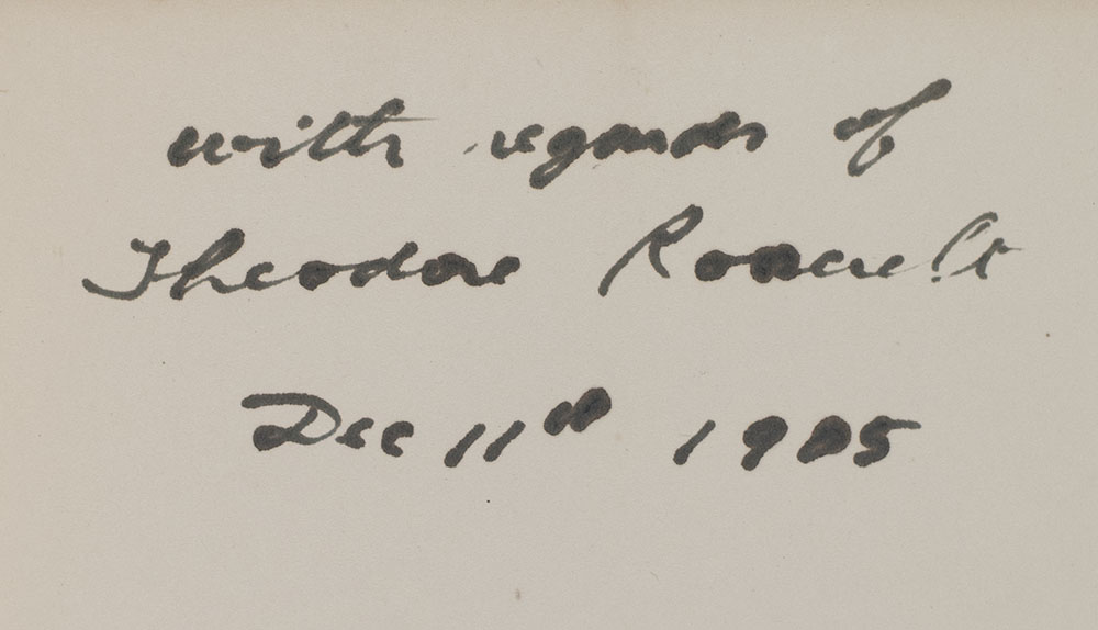 First edition of Roosevelt's important collection of first-hand hunting accounts, including a lengthy description of newly created wilderness reserves. Octavo, original cloth, gilt titles to the spine and front panel, frontispiece portrait of Roosevelt with tissue guard present, illustrated with photographs. Signed by the author in the year of publication on the second preliminary leaf, "with regards of Theodore Roosevelt Dec 11th 1905." In near fine condition, crease to the front free endpaper. Trade editions are uncommon signed, especially in the year of publication.