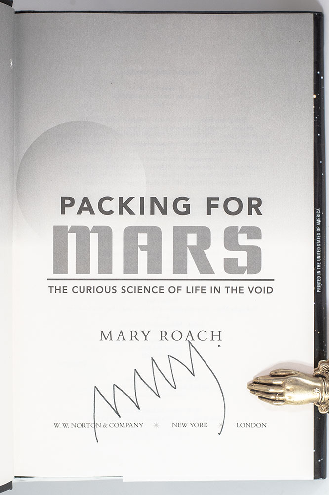 “Space doesn't just encompass the sublime and the ridiculous. It erases the line between": First edition of Mary Roach's Packing For Mars; signed by her