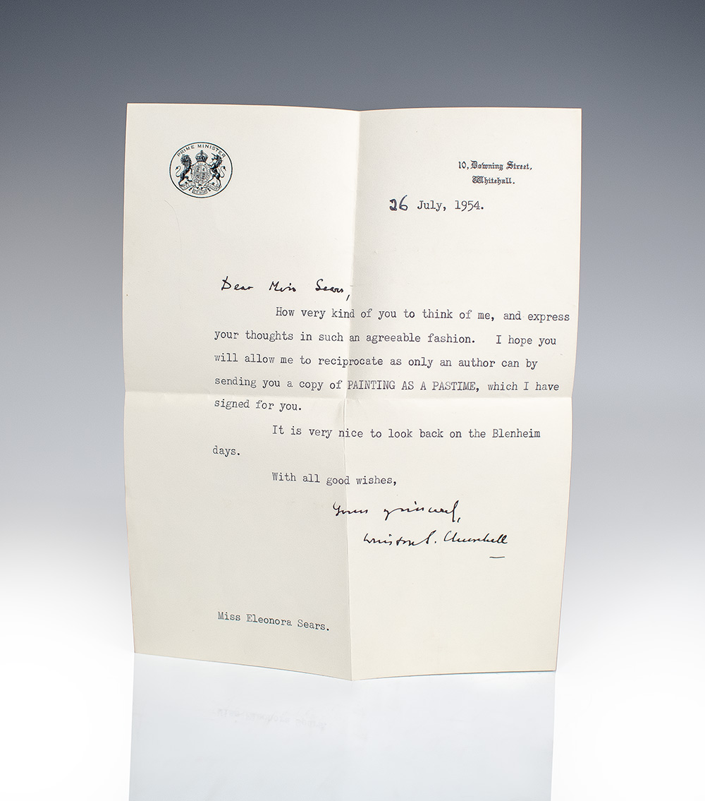 First edition, early printing of this collection of Churchill's brilliant essays on hobbies and painting. Octavo, original cloth, frontispiece, illustrated with eighteen reproductions of Churchill's paintings in full color. Presentation copy, inscribed by Churchill on the front free endpaper, "To Eleonora Sears, from Winston S. Churchill - 1954." Accompanied by a typed letter signed by Churchill to Sears laid in, the letter reads in full, "How very kind of you to think of me, and express your thoughts in such an agreeable fashion. I hope you will allow me to reciprocate as only an author can by sending you a copy of Painting As A Pastime, which I have signed for you. It is very nice to look back on the Blenheim days. With all good wishes." Sears won the U.S. Women's National Doubles Championship in tennis four times and was an advocate for women's participation in competitive sports. Her influence extended beyond athletics, as she championed women’s rights in physical fitness and social mobility. Near fine in the original dust jacket which is in very good condition. Rare and desirable signed.