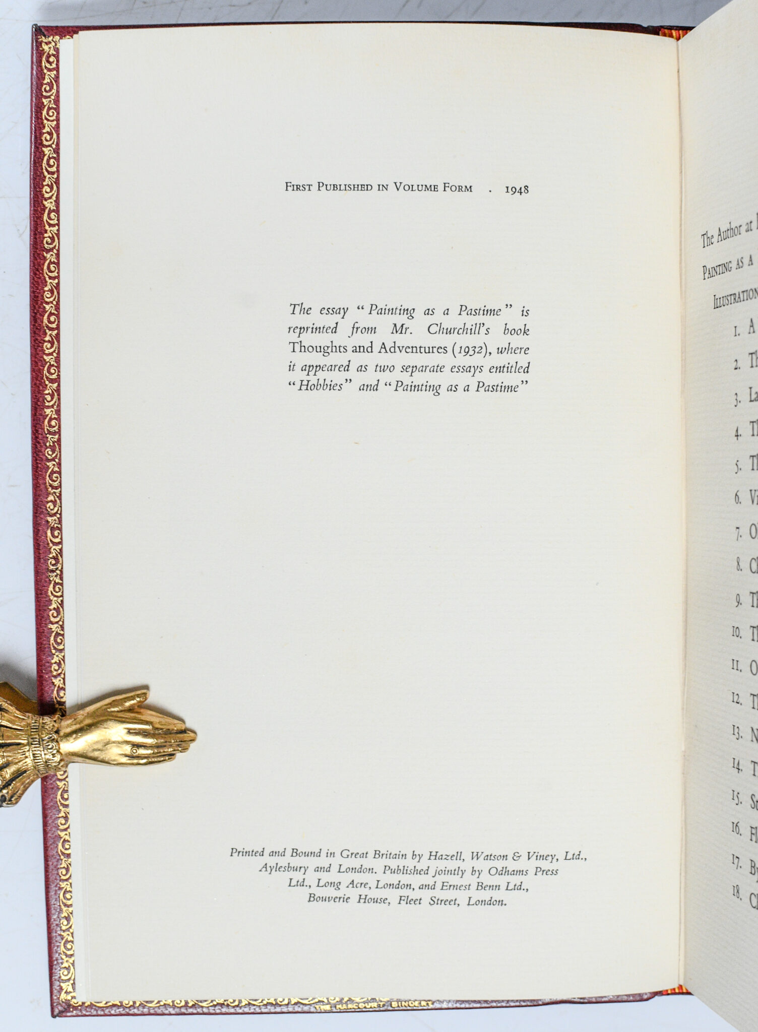 First edition of this collection of Churchill's brilliant essays on hobbies and painting. Octavo, bound in full morocco by the Harcourt Bindery, 22 karat gilt titles and tooling to the spine in six compartments within raised gilt bands, gilt signature to the front panel, gilt ruling to the front and rear panels, gilt inner dentelles stamp-signed by the Harcourt Bindery, marbled endpapers, all edges gilt, illustrated throughout. In fine condition.