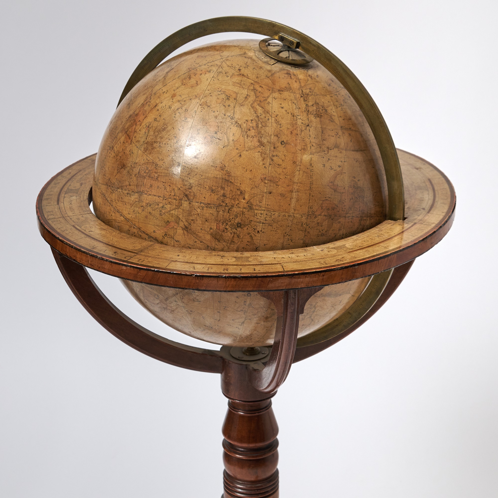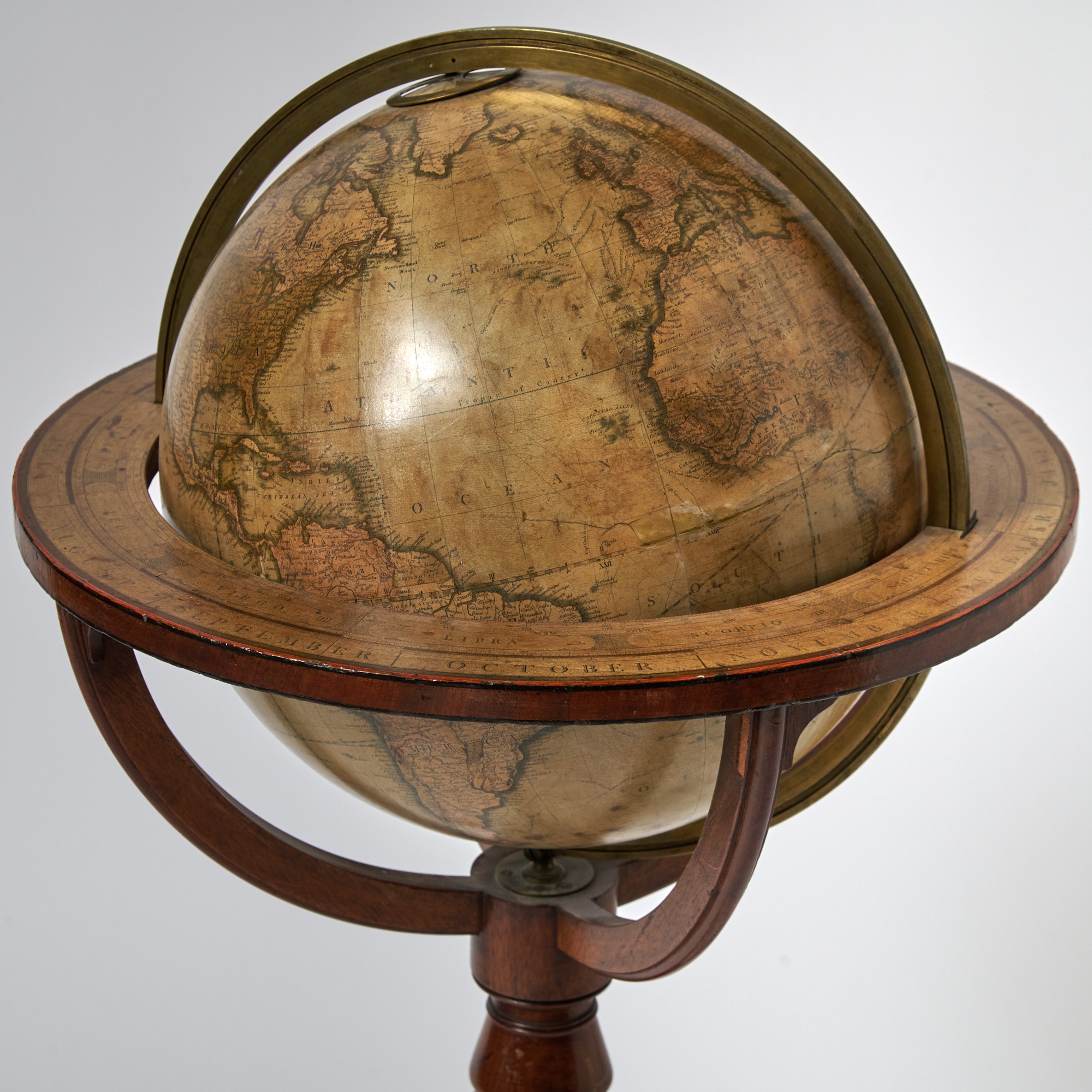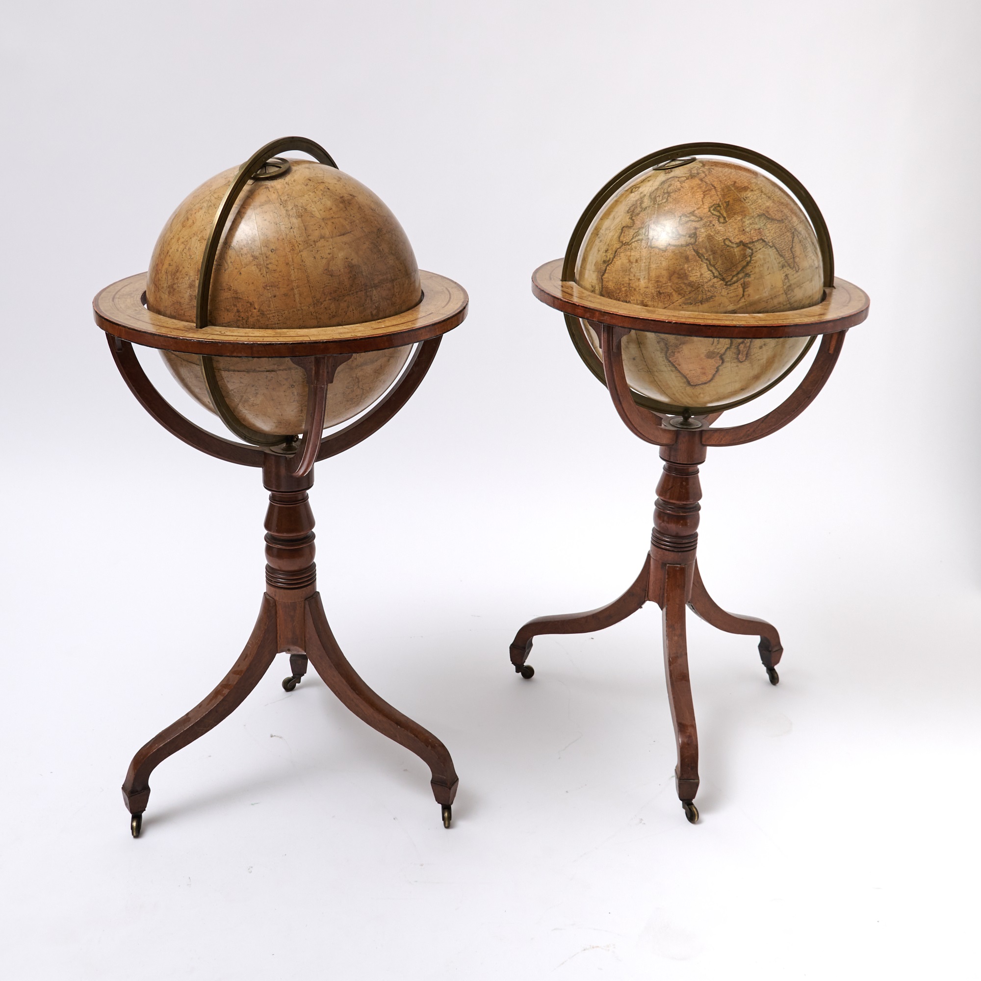 Fine pair of early 19th century celestial and terrestrial table globes published by John and William Cary, generally regarded as the greatest British globe makers of the late Georgian period. Comprised of Cary's New Terrestrial Globe, Drawn from the most recent Geographical works, shewing the whole of the New Discoveries with the Tracks of the Principal Navigators and every improvement in Geography to the present Time. London: G. & J. Cary, 1833. Together with, Cary's Celestial Globe, of which are carefully laid down the whole of the Stars and Nebulae contained in the Catalogues of Wollaston, Herschel, Bode, Piazzi, Zach, &c. calculated to the year 1820. London: J. & W. Cary, 1818. Two globes, each with twelve hand-colored engraved paper gores over a papier mache and plaster sphere, varnished, mounted in brass meridian rings, with brass hour circles at northern poles, on turned mahogany tripod stands, horizon bands with pasted down and varnished hand-colored printed zodiacal calendars, the base on metal caster feet. In very good condition with some wear, scattered light toning, and repaired cracks. The globes measure 15 inches in diameter and 38 inches in height.