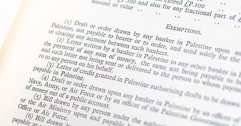 Original printing of this record of the movement of money in Palestine during the calendar year of 1931. Quarto, original wrappers, rebacked, illustrated with tables. In good condition with rubbing to the extremities, dampstaining to the fore-edge and rear panel, light toning to the first and last few leaves, institutional stamps to the title page and rear free endpaper.
