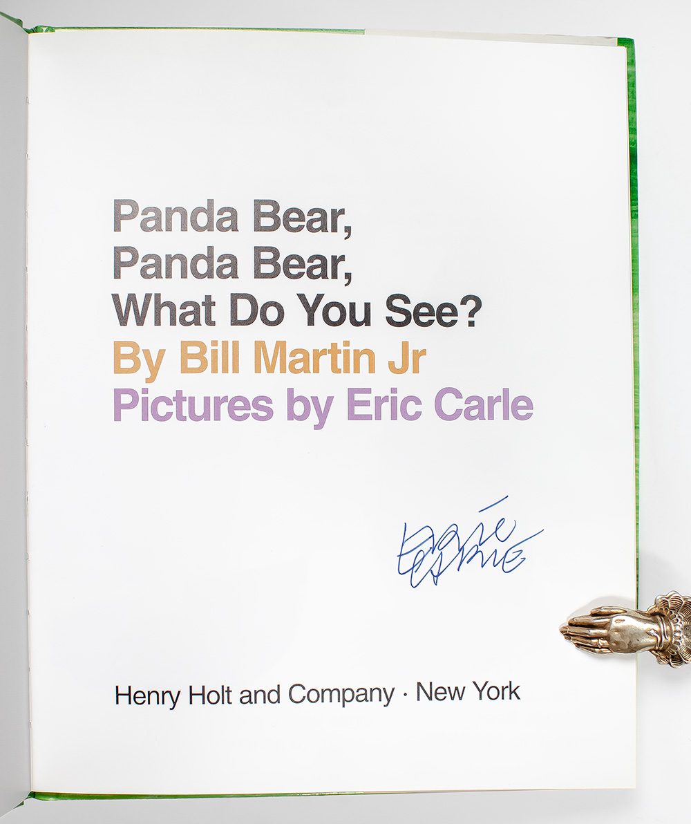 First printing of the children's classic Panda Bear, Panda Bear, What Do You See? Quarto, original illustrated boards, pictorial endpapers, illustrated by Eric Carle. Signed by Carle on the title page. In fine condition.
