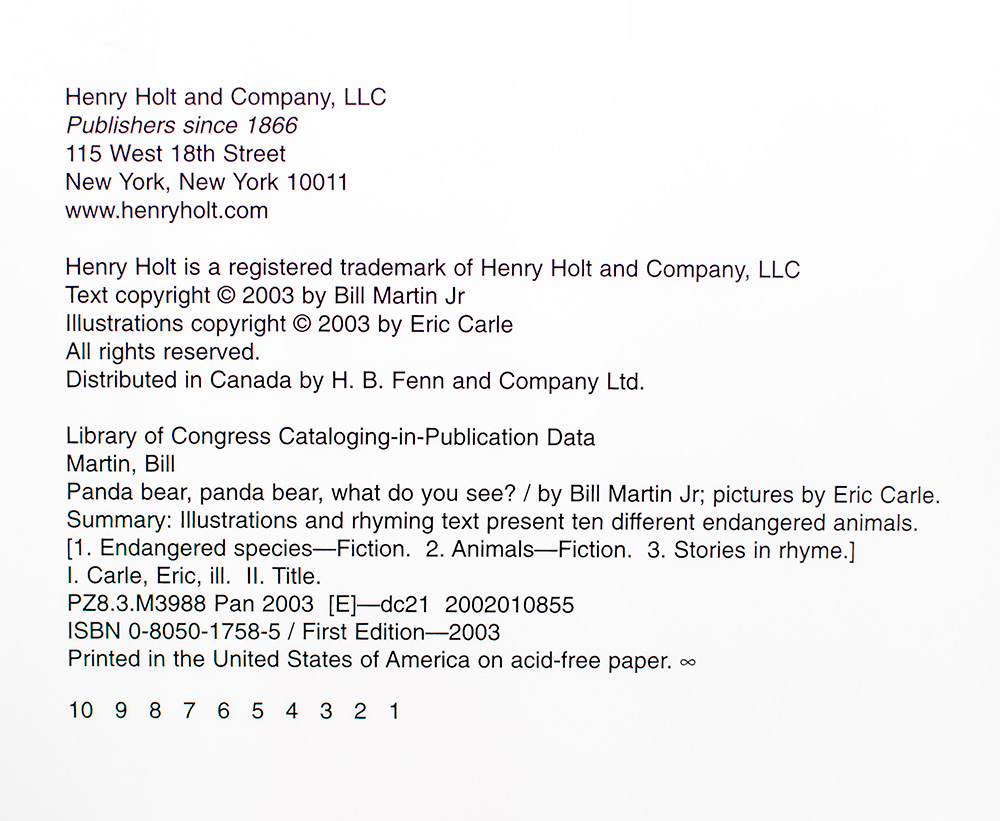 The third companion book to Bill Martin Jr.'s Brown Bear, Brown Bear, What Do You See?, Panda Bear, Panda Bear, What Do You See? features an assortment of endangered animals including a panda bear, bald eagle, spider monkey, green sea turtle, red wolf, whopping crane, and black panther illustrated in Carle's distinctive and instantly recognizable hand-painted collage technique.