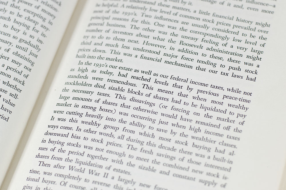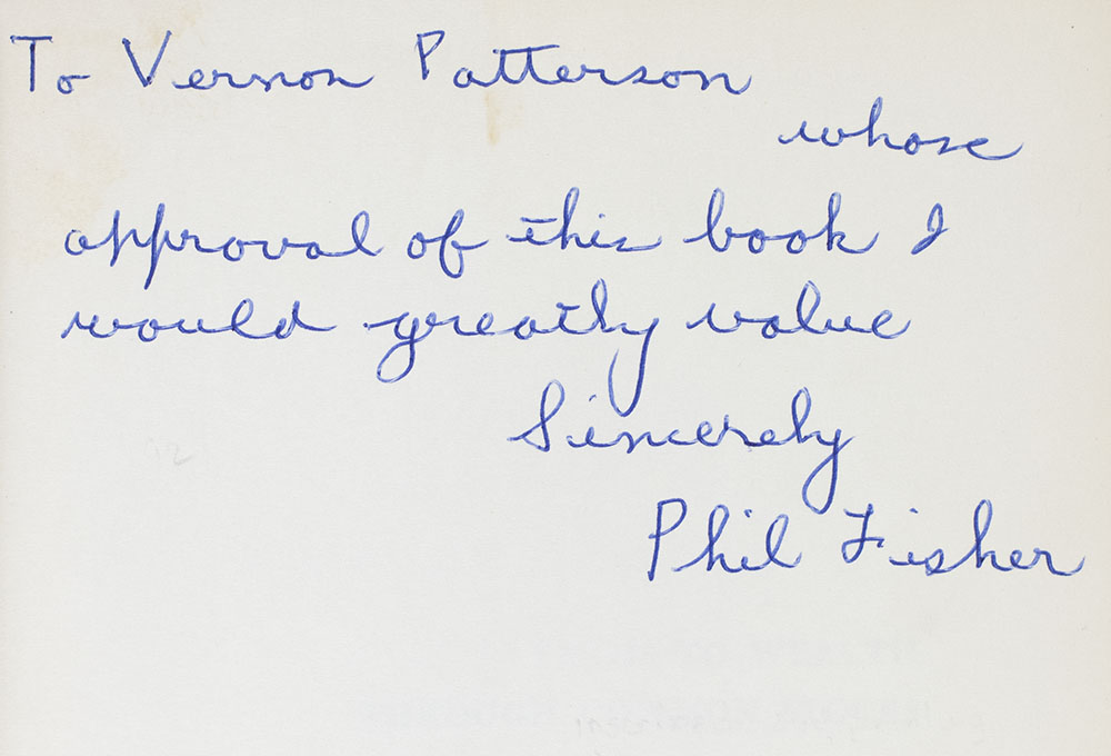 First edition, second printing of Fisher's second book. Octavo, original half cloth. Presentation copy, signed by the author on the front free end paper, "To Vernon Patterson whose approval of this book I would greatly value Sincerely Phil Fisher." Near fine in a very good dust jacket.