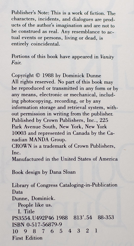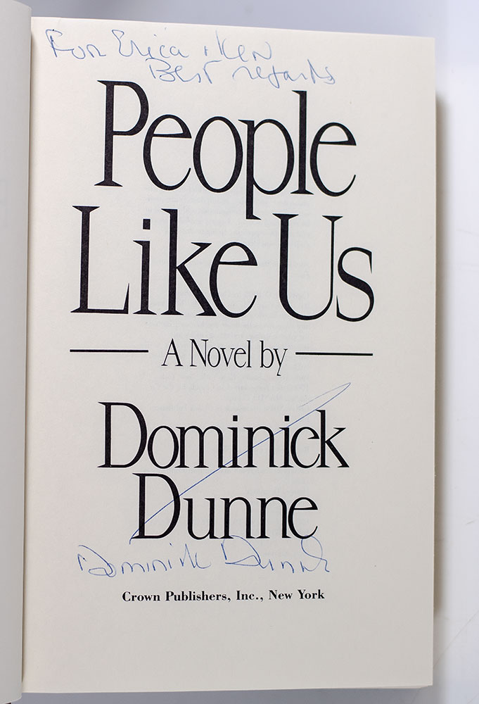 First edition of Dominick Dunne's People Like Us; inscribed by him to Erica Jong and her husband Ken Burrows