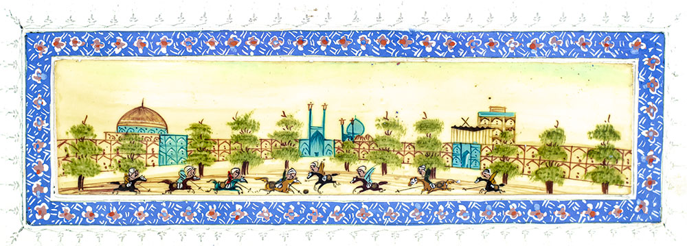 Rare Persian miniature painting depicting an ancient game of Chovgan, later adopted in the Western World as the game of polo. Affixed to an elaborately decorated paper mount, the painting depicts two opposing teams engaged in a game of Chovgan before a Persian cityscape. The ancient game of Chovgan originated in the middle of the first millennium A.D. in ancient Iran and was a Persian national sport played extensively by the nobility. Fragments of the game were periodically portrayed in ancient miniatures, and also detailed descriptions and rules of the game were also given in the ancient manuscripts. Englishmen had a great role in distribution and development of the game in Europe and the whole world. So chovgan – brought from India to England in the 19th century became more popular and addition of new rules into it favored quick spreading of this game in Europe and the USA. Namely on the initiative of Englishmen this game acquired its present name – polo and was included into program of the Olympic Games held in 1900, in Paris. In fine condition. Housed in an elaborate period frame. The entire piece measures 11.25 by 5.75 inches.