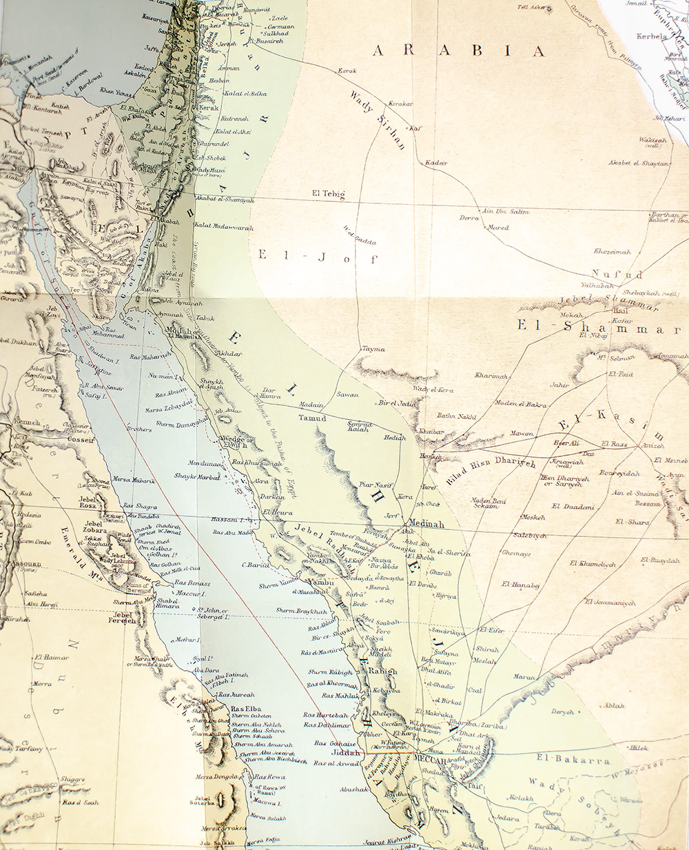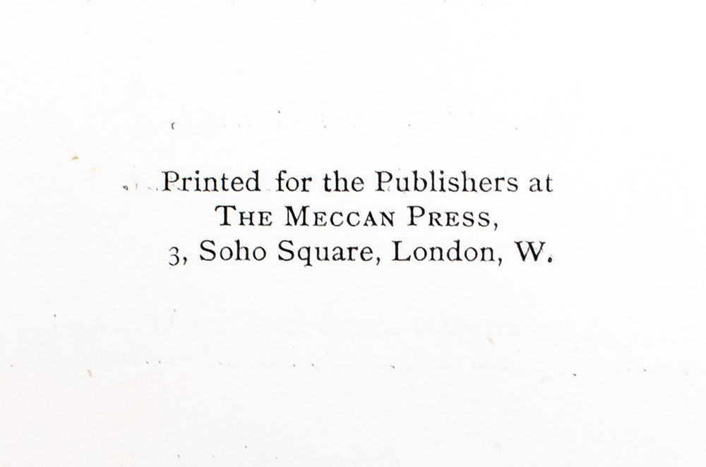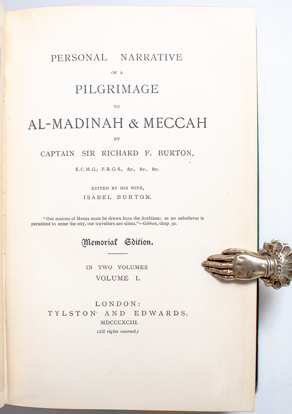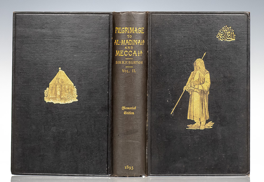 The Memorial edition of one of “the greatest works of travel ever published” (Penzer, 49). Octavo, two volumes, original publisher's decorative black cloth with gilt titles to the spine and central gilt portrait of Burton as Mirza Abdullah and Arabic script to the front panel of each volume, top edges red, black endpapers, tissue-guarded frontispiece portrait of Isabel Burton to Vol. I, tissue-guarded colored frontispiece portrait of Burton to Vol. II, illustrated with  5 chromolithographic plates, 9 tinted plates, 28 illustrations, 3 folding plans, and color folding map of the route of Sir Richard Burton from Suez to Al-Madinah, Meccah, and back. In very good condition with rubbing to the front panels, ownership stamps opposite the half-title page of each volume.