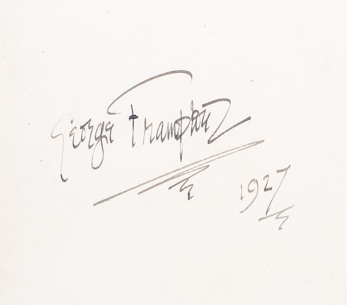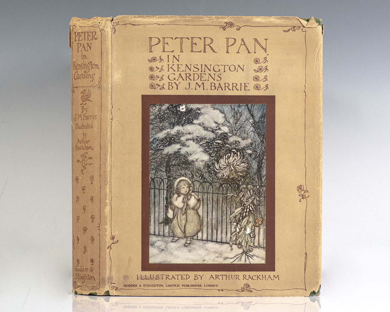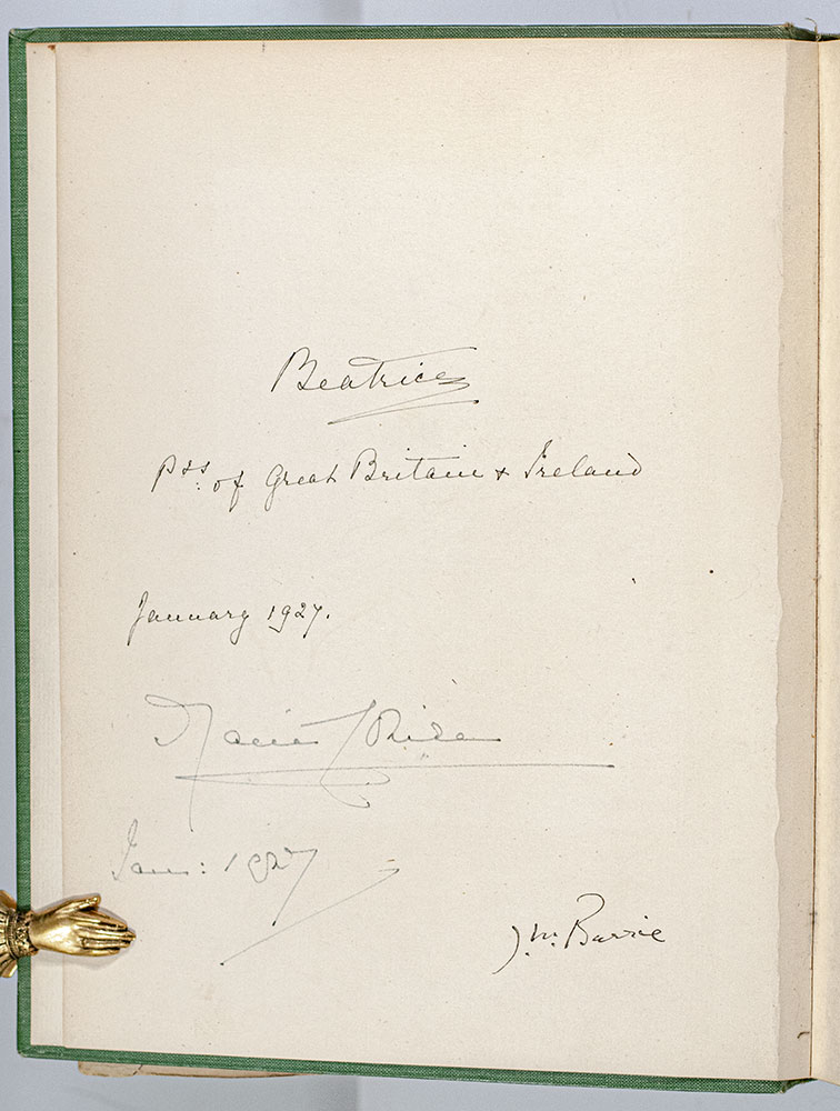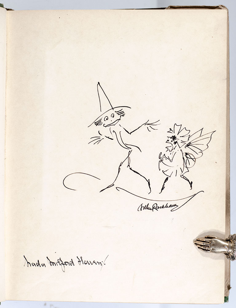 New edition of Rackham’s highly-sought-after masterpiece, which established his reputation as one of England’s premier illustrators. Quarto, original publisher's green cloth elaborately decorated in gilt, illustrated by Arthur Rackham with 50 mounted color plates complete with captioned tissue guards including frontispiece. Association copy, signed by author J.M. Barrie on the verso of the front free endpaper, signed by Arthur Rackham on the recto of the frontispiece with an original drawing as well as Nadejda "Nada" Mountbatten, Marchioness of Milford Haven, signed by the sculptor of the Peter Pan statue in Kensington Gardens, George Frampton on front pastedown, and signed by Princess Beatrice and Princess Marie Louise on the verso of the front free endpaper, "Beatrice Princess of Great Britain & Ireland January 1927" and "Marie Louise Jan. 1927." A January 4, 1927 issue of the Westminster Gazette explains the book's origin as a prize offered for "the best costumes from 'Peter Pan' and 'Peter Pan in Kensington Gardens'" at an annual London charity "Peter Pan" party. "There were not many 'Peter Pans.' Boys preferred pirates, most of them fierce-looking, with daggers protruding from their belts. Among the prizes were books of the play by Sir J. M. Barrie, autographed by Princess Beatrice, Princess Marie Louise, Lady Milford Haven, Sir James Barrie, Sir George Frampton, and Mr. Arthur Rackham." Near fine in a near fine dust jacket. Small closed tear to the foot of the title page. Housed in a custom half morocco clamshell box. A splendid association copy of Rackham's masterpiece.