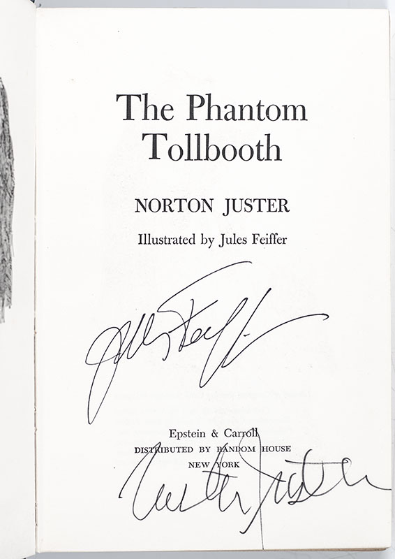 First edition of this modern classic. Octavo, original blue cloth, cartographic endpapers, illustrated by Jules Feiffer. Signed by both Norton Juster and illustrator, Jules Feiffer on the title page. Fine in a near fine dust jacket with some professional restoration to the extremities. Desirable signed by both Juster and Feiffer.