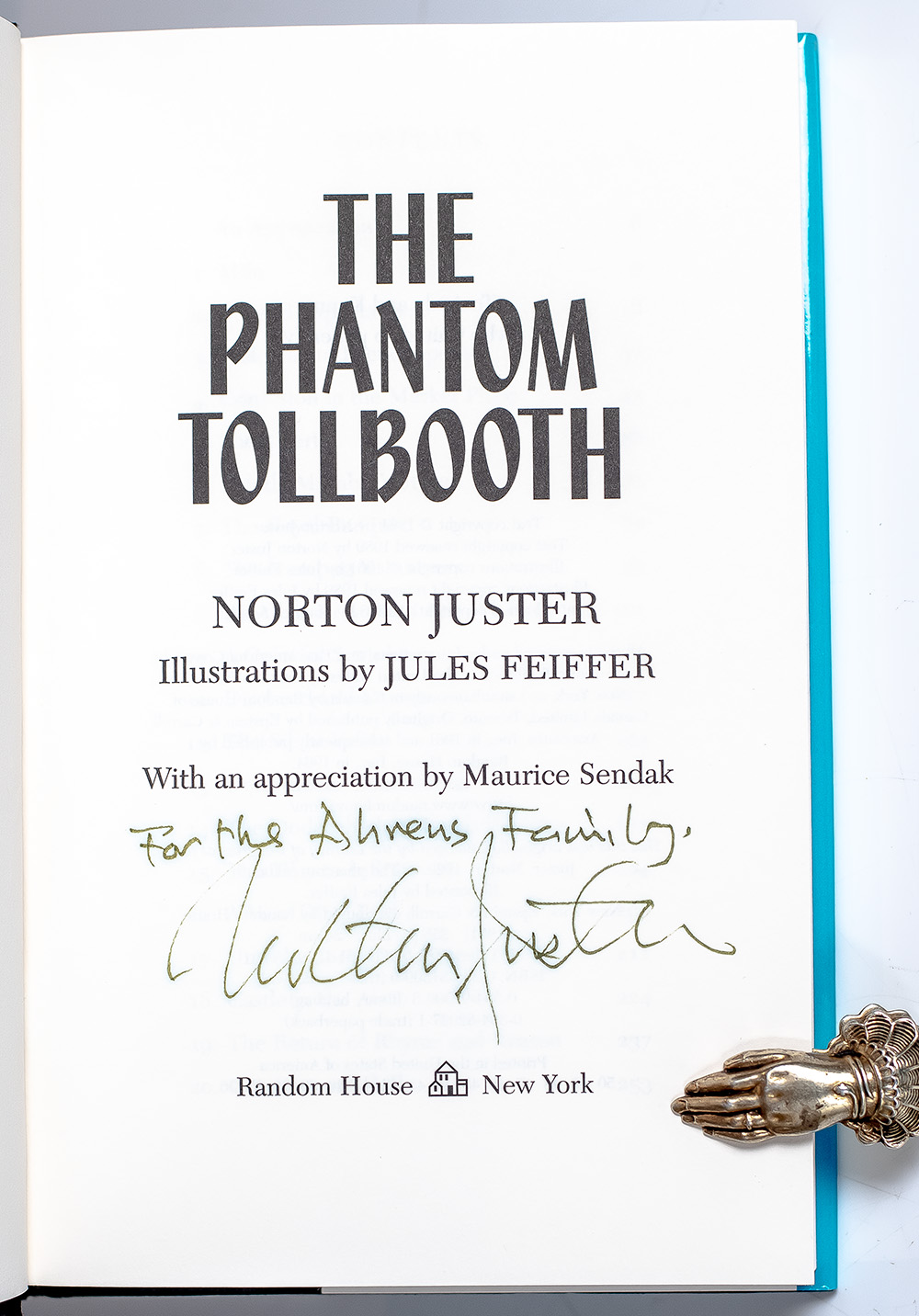 Early printing of the 35th Anniversary edition of this classic work. Octavo, original half cloth, cartographic endpapers, illustrated by Jules Feiffer. Presentation copy, inscribed by the author on the title page, "For the Ahrens Family, Norton Juster." Fine in a near fine dust jacket. With an appreciation by Maurice Sendak.