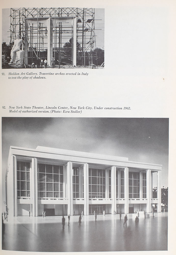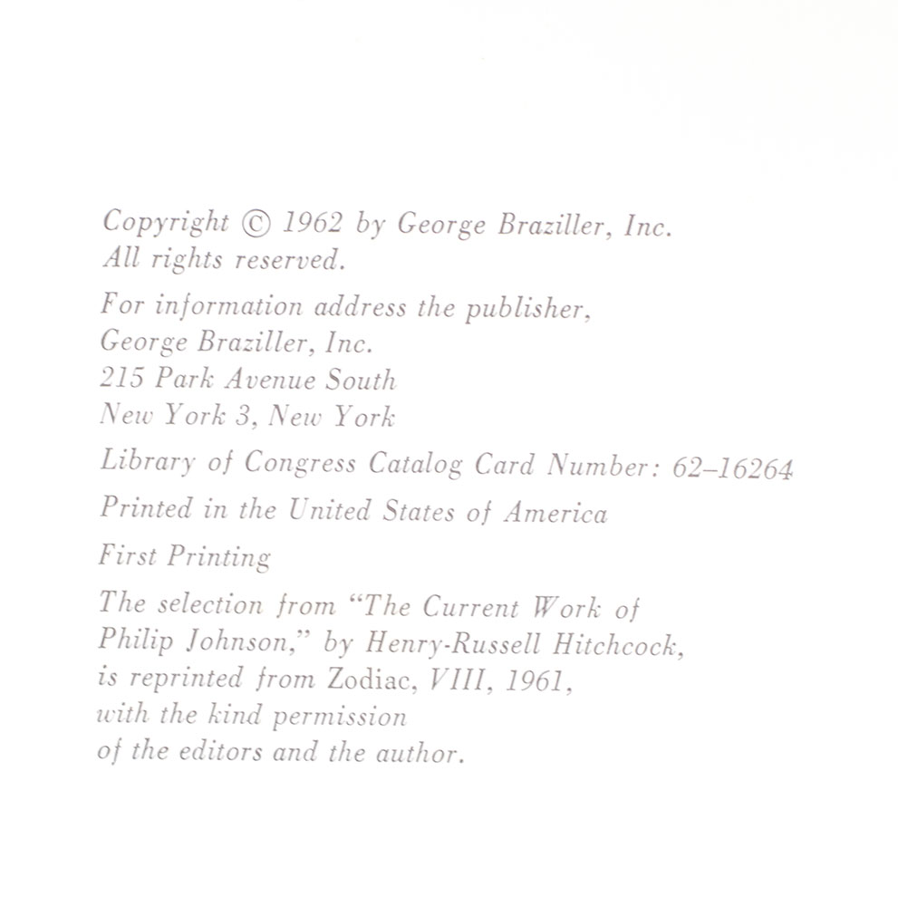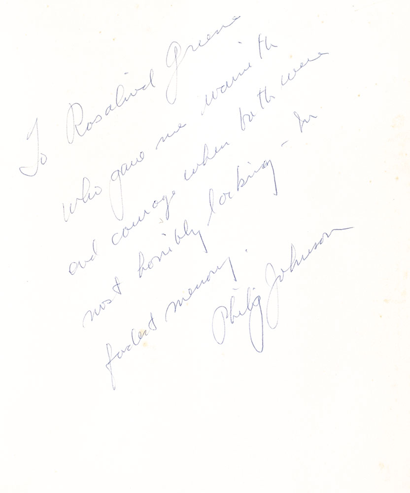 First edition of this work on the Pritzker Prize-winning architect. Quarto, original half cloth, illustrated Presentation copy, inscribed by the author on the front free endpaper, "To Rosalind Greene Who gave me warmth and courage when both were most horribly lacking - in fondest memory. Philip Johnson." Two autographed letters signed and three typed letters signed from Johnson totally five pages loosely inserted along with assorted magazine and newspaper articles. Near fine in a very good dust jacket. Jacket design by Lustig and Reich.