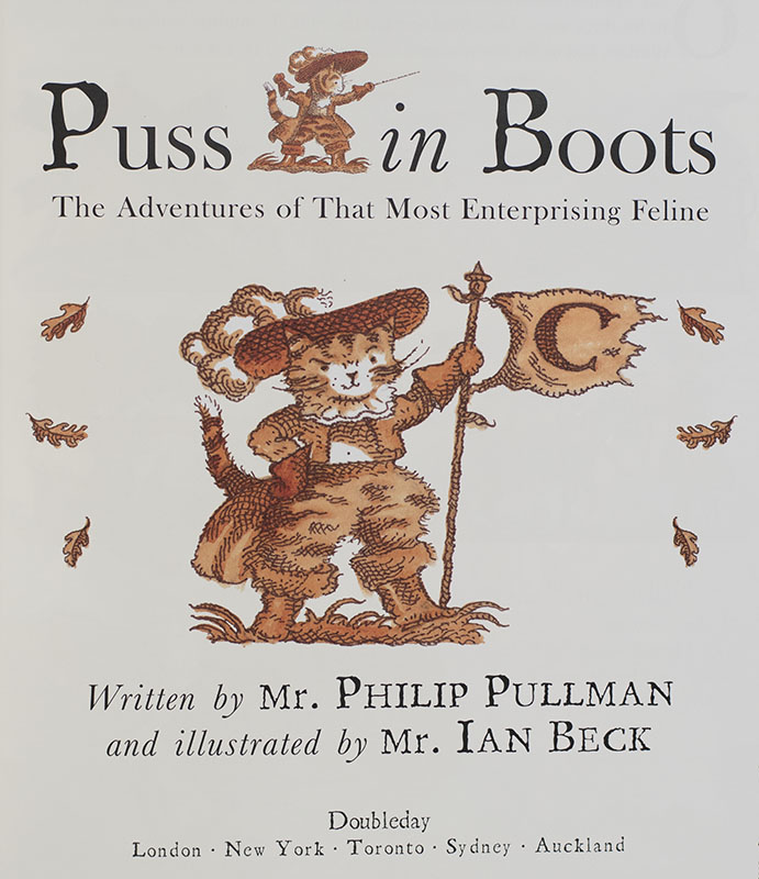 Fine collection of first editions by children's book author Philip Pullman. Quarto, 3 volumes, original boards and wrappers, illustrated. The collection includes a two first edition of Puss in Boots (London: Doubleday: 2000), a first Picture Corgi edition of Puss in Boots (London: Picture Corgi Books, 2000), and a first edition of Aladdin and the Enchanted Lamp (London: Scholastic Children's Books, 2004). Each volume is in fine condition.