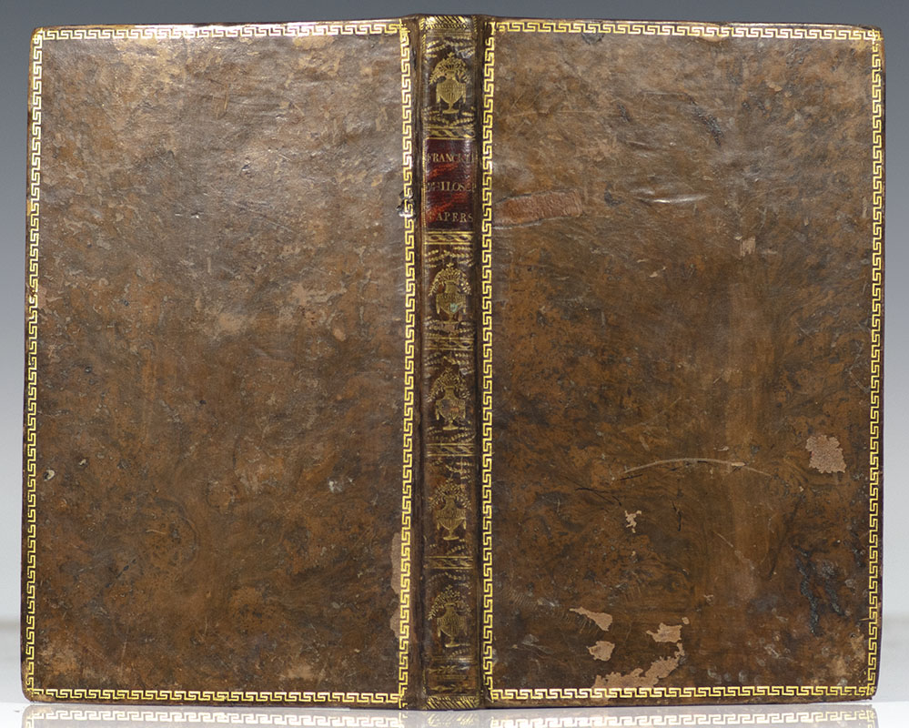 First edition of the last collection of Franklin's writings to appear during his lifetime; a major collection of his political, philosophical and scientific writings, a second volume of which was planned but never published. First issue with page 25 mispaginated "52." Octavo, bound in full contemporary tree calf with elaborate gilt tooling to the spine, red morocco spine label lettered in gilt, gilt Greek key ruling to the front and rear panels. With four copper-engraved folding plates including diagrams of the Franklin stove and the earliest published map of the Gulf Stream. In very good condition. Armorial bookplate and early ownership inscriptions. Text and plates very clean. Rare.