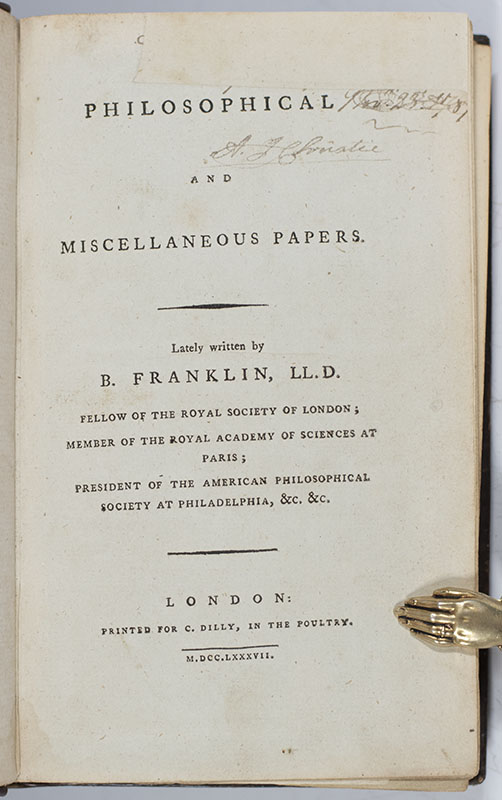 "THE LAST COLLECTION OF FRANKLIN'S WRITINGS TO APPEAR IN HIS LIFETIME": First edition of Benjamin Franklin's Philosophical and Miscellaneous Papers