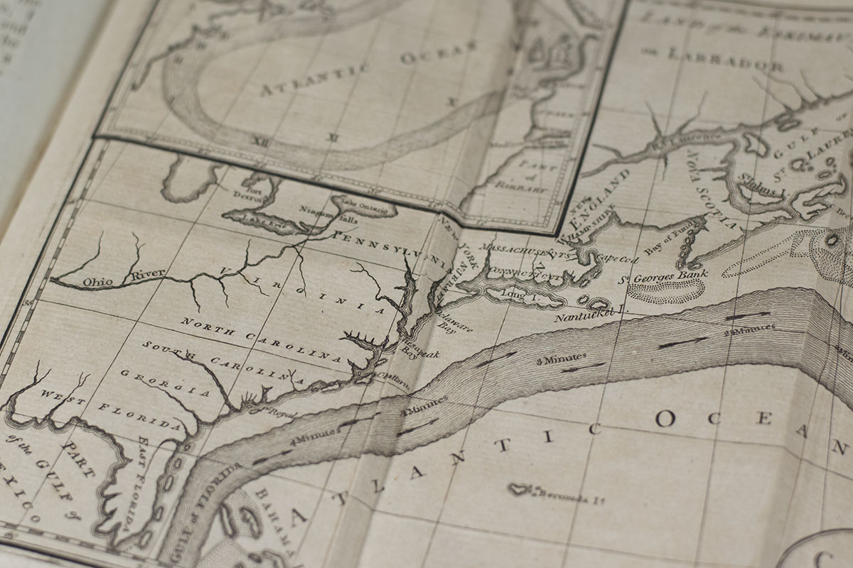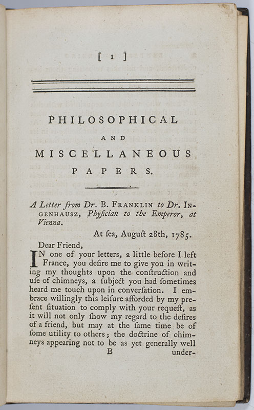Intended by the publisher as a companion volume to the Experiments and Observations on Electricity (1769) and his Political, Miscellaneous and Philosophical Pieces (1779), Franklin's Philosophical and Miscellaneous Papers contains a selection of important political essays including his Remarks concerning the Savages in North America (1784), The letter from Dr. B. Franklin to Benjamin Vaughan… of Privateering (1785), and Information to those who would remove to America (1784), which is "one of the clearest expressions of his belief that American society should be based on the virtues of the middle… classes" (Isaacson, 423). Also highly notable is Internal State of America, his sharply optimistic postwar reply to "complaints of hard times in the American press… with an equally sharp consciousness of British propaganda" (Crane, William and Mary Quarterly, XV:2, 218). This volume additionally contains three major scientific writings: Description of a New Stove for the burning of Pitcoal (1785), Letter from Dr. B. Franklin to Dr. Ingenhausz [On the Causes and Cure of Smoky Chimneys] (1785), and Letter from Dr. Benjamin Franklin… containing sundry Maritime Observations (1785). Merging his political and scientific interests, Franklin used Maritime's study of the sea and Gulf Stream to "proclaim the virtues of his nation and its people." This inspired others to also "think of the Gulf Stream in political terms. In 1790 Thomas Paine declared the French Revolution 'as fixed as the Gulf Stream' and Jonathan Williams claimed the current's waters were as distinct as 'the colors of red, white and blue'" (Chaplin, 320-25).