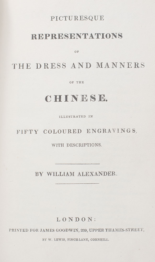 Picturesque Representations and the Dress and Manners of the Chinese. Illustrated with Fifty Coloured Engravings, with Descriptions.