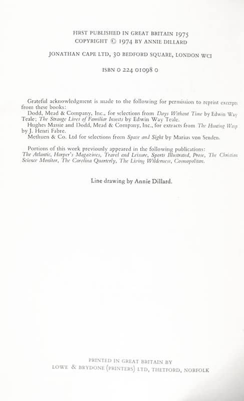 First British edition of the author's Pulitzer Prize-winning work. Octavo, original cloth. Signed by Annie Dillard on the title page. Fine in a fine dust jacket. Introduction by Richard Adams. Jacket picture by Sheila Berger. Jacket design by M. Mohan. Author's photograph by Jill Kremenz. Line drawing by Annie Dillard.