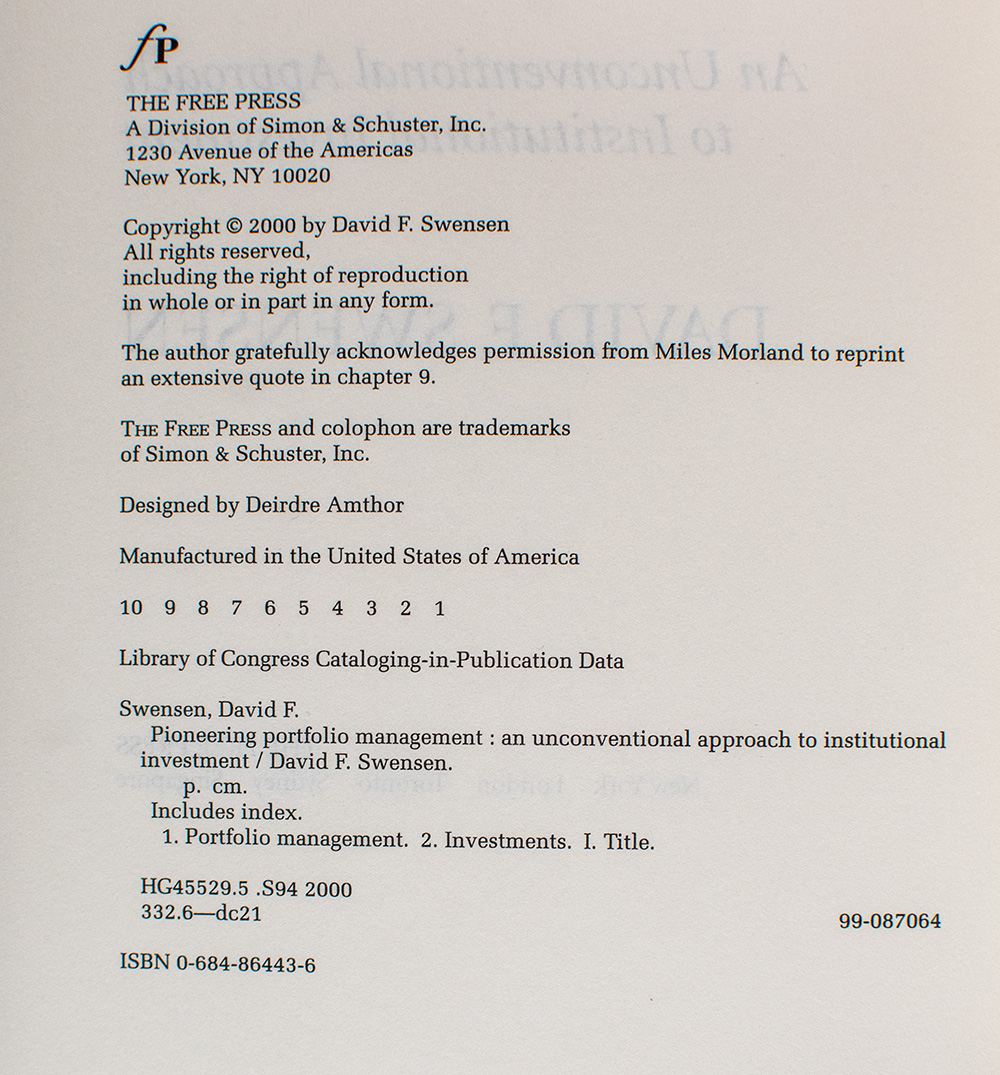 First Edition of David Swensen's Pioneering Portfolio Management: An Unconventional Approach to Institutional Investment