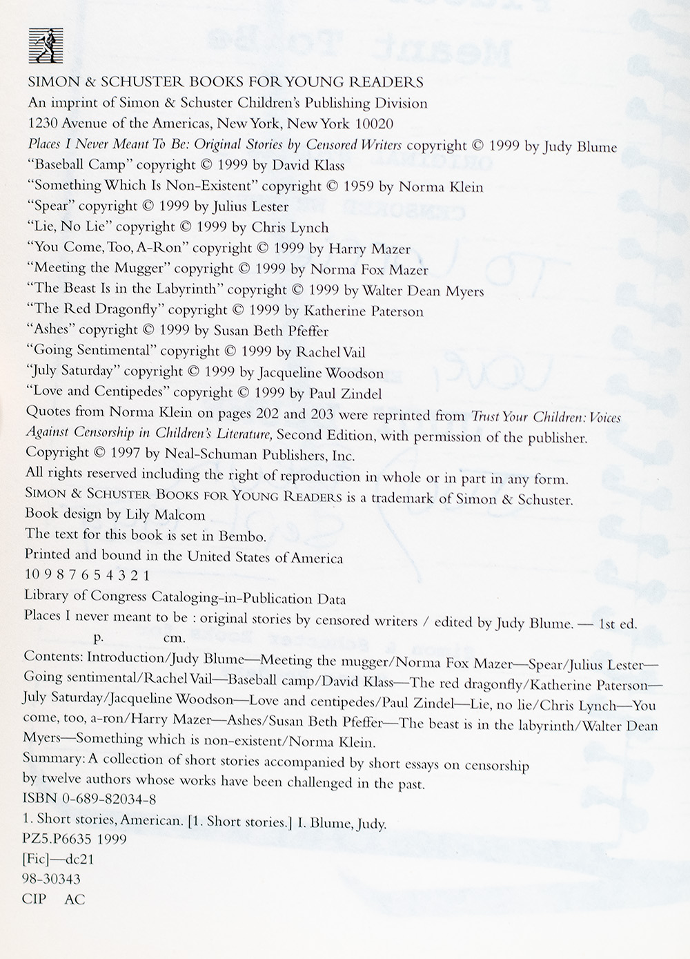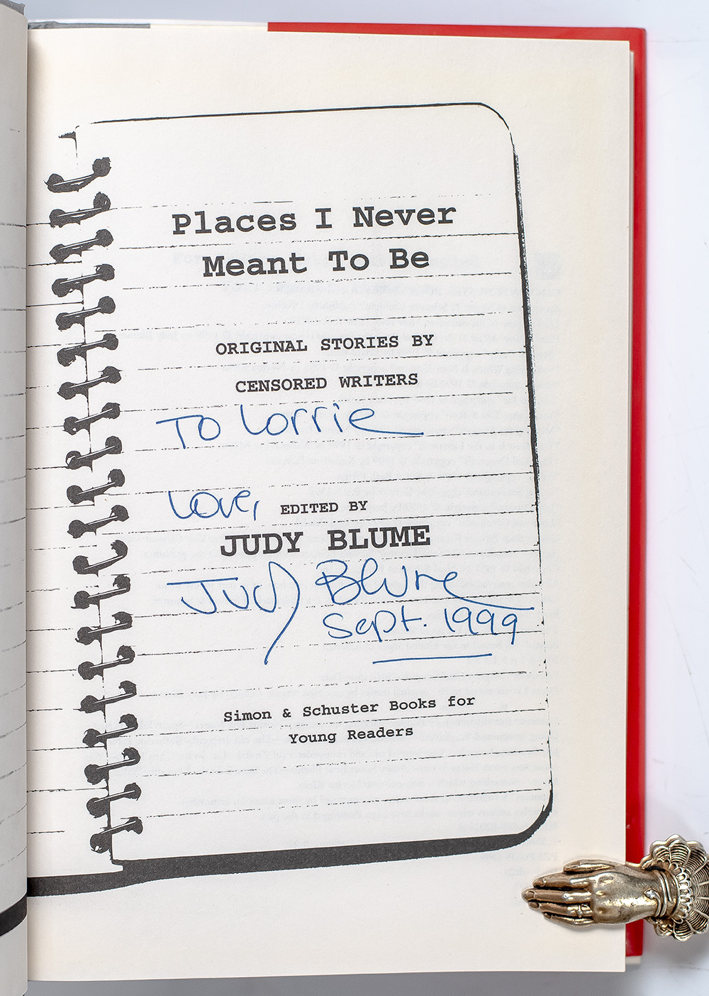 First Edition of Places I Never Meant To Be: Original Stories By Censored Writers; Inscribed by Judy Blume