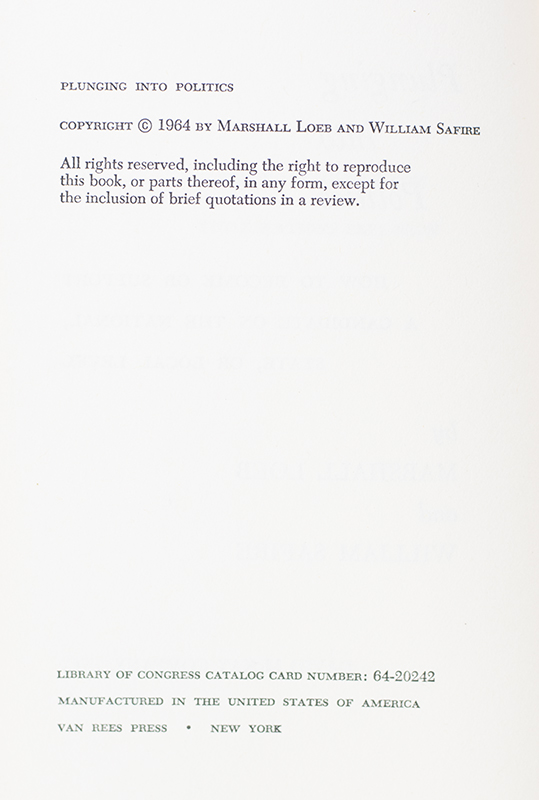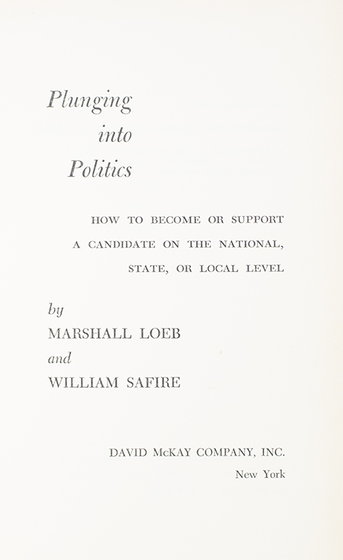 First edition of Marshall Loeb and William Safire's Plunging into Politics; from the library of William Safire