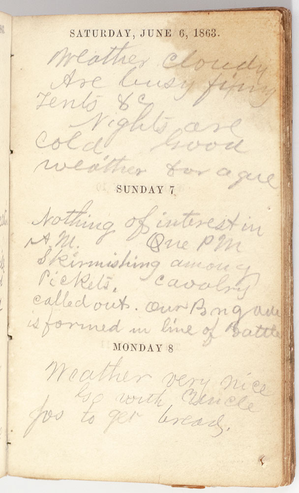 The Civil War pocket diary of Assistant Surgeon Robert P. Davis, 84th Indiana Regiment. 16mo, original wrappers, the diary is printed with blank three days per page, entries have been recorded intermittently beginning on January 1, 1863 and include brief accounts of skirmishes at Resaca, Hooker's rescue of the Indiana Regiment and reports of duties and the diarist's own illness: May 27: “I am on duty at the Hospital handing instruments for amputation.” The next day: “At same duty as yesterday.” June 1: the sick and wounded are moved to a more permanent hospital and their field tents are moved to the left of the line. The diarist was very ill himself during March and April of 1863. Three memorandum pages and one Cash Account page have injury reports with name, company, and injury (“Bowels Sever[e];” “Killed;” “L. side and arm – Sever[e]”, etc. Two more pages have mileages between towns, mostly in this part of Tennessee. Robert P. Davis was born in Lawrence, Ohio in 1836. The family was in Linn Co., Missouri about 1850 and in Randolph, Indiana about 1860. Davis enlisted as a 1st Sergeant in the Indiana 84th Volunteer Infantry in August 1862. He seems to have spent much of his time as a hospital steward. He mentions a few times in his diary that he was assigned to take sick soldiers to the hospital. By the end of the war (April 1865) he was promoted to Assistant Surgeon. In near fine condition. A rare and desirable first hand account of America's greatest moral, cultural, constitutional, and political crisis.